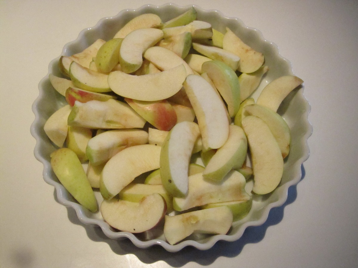 Æblerne ordnes og skæres i smalle både, som ligges i fadet. Jeg brugte 5-6 gode syrlige æbler fra haven til min æble crumble.
