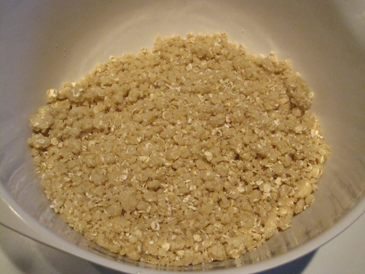 Så blandes alle ingredienserne til dejen sammen i en skål. Det er lettest bare at skære smørret i lidt mindre stykker, og så smuldre det hele sammen med hænderne, til det har en nogenlunde ensartet smuldrende struktur.