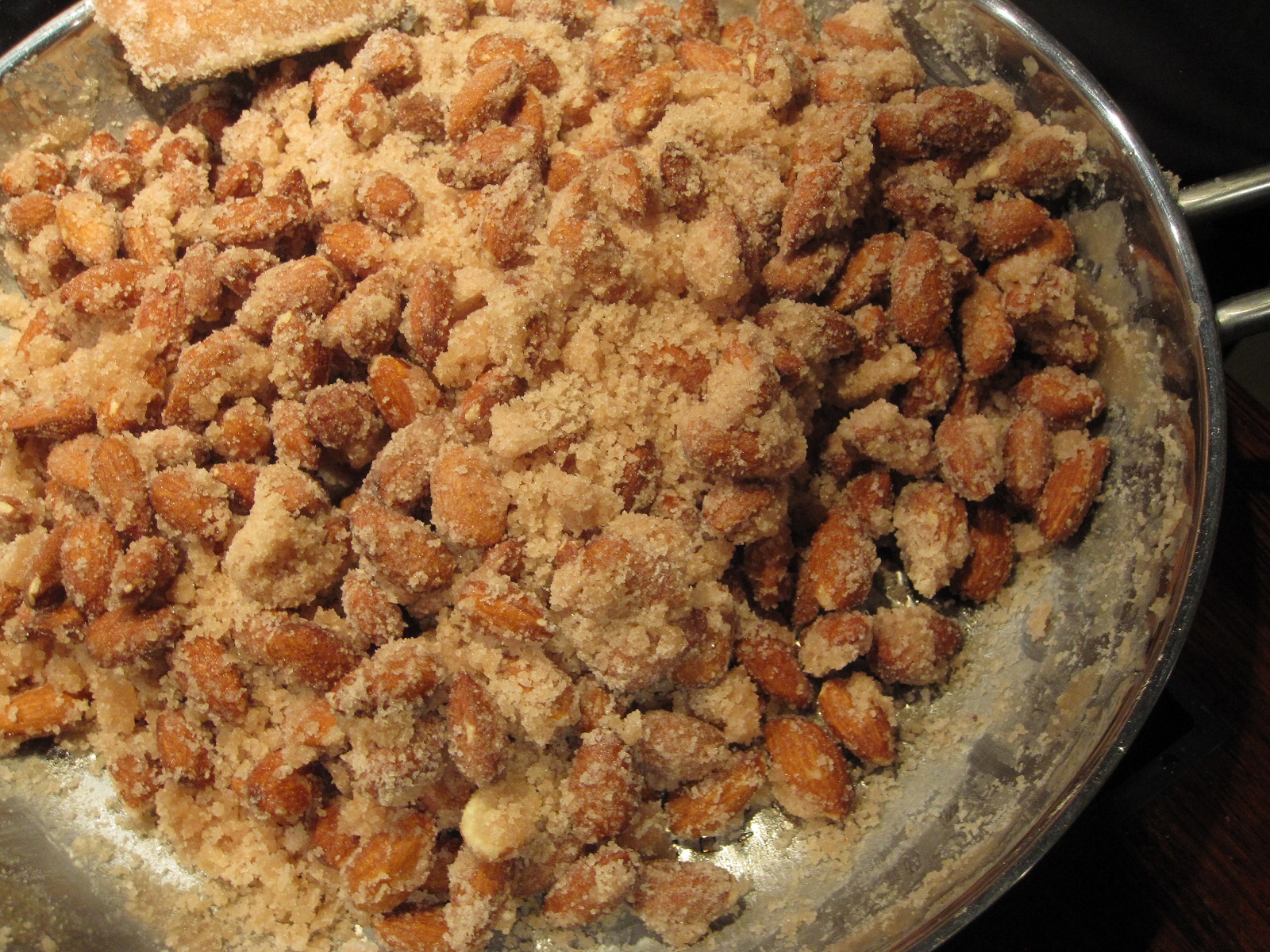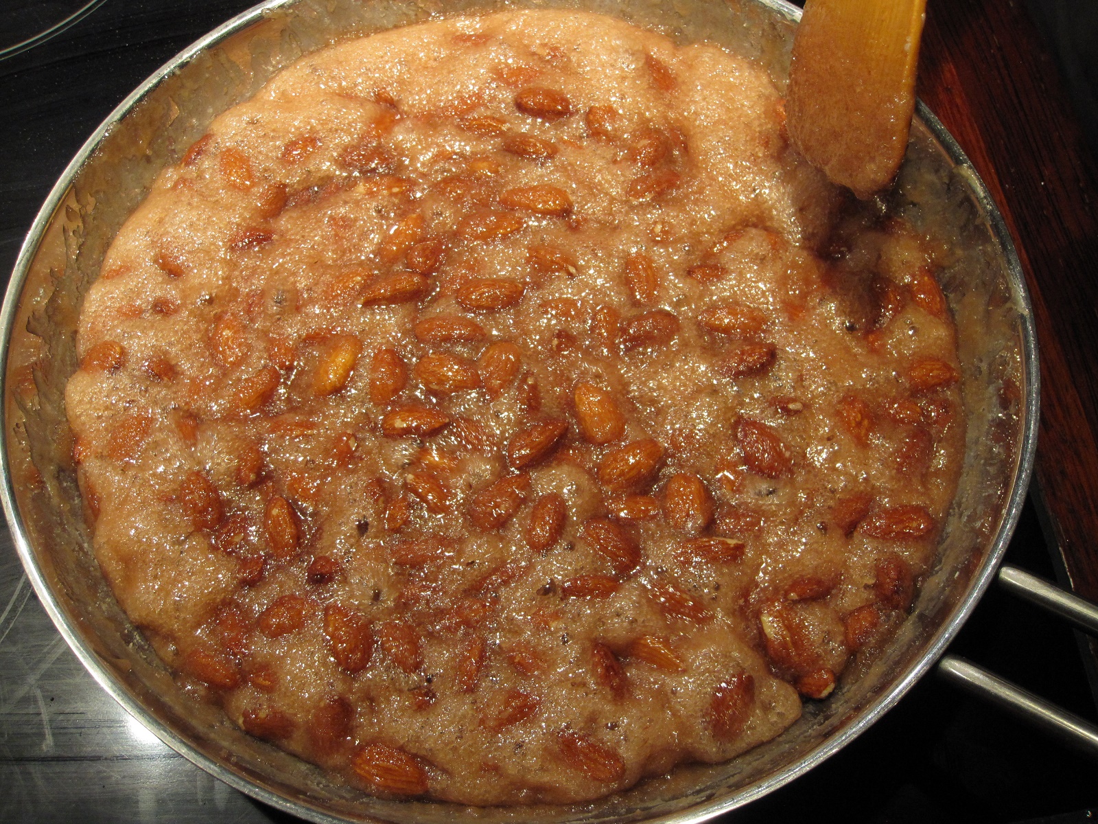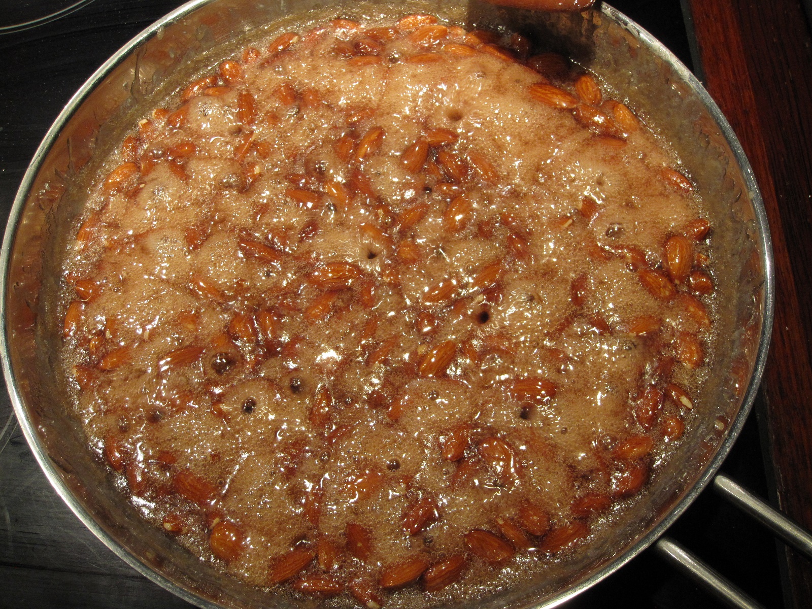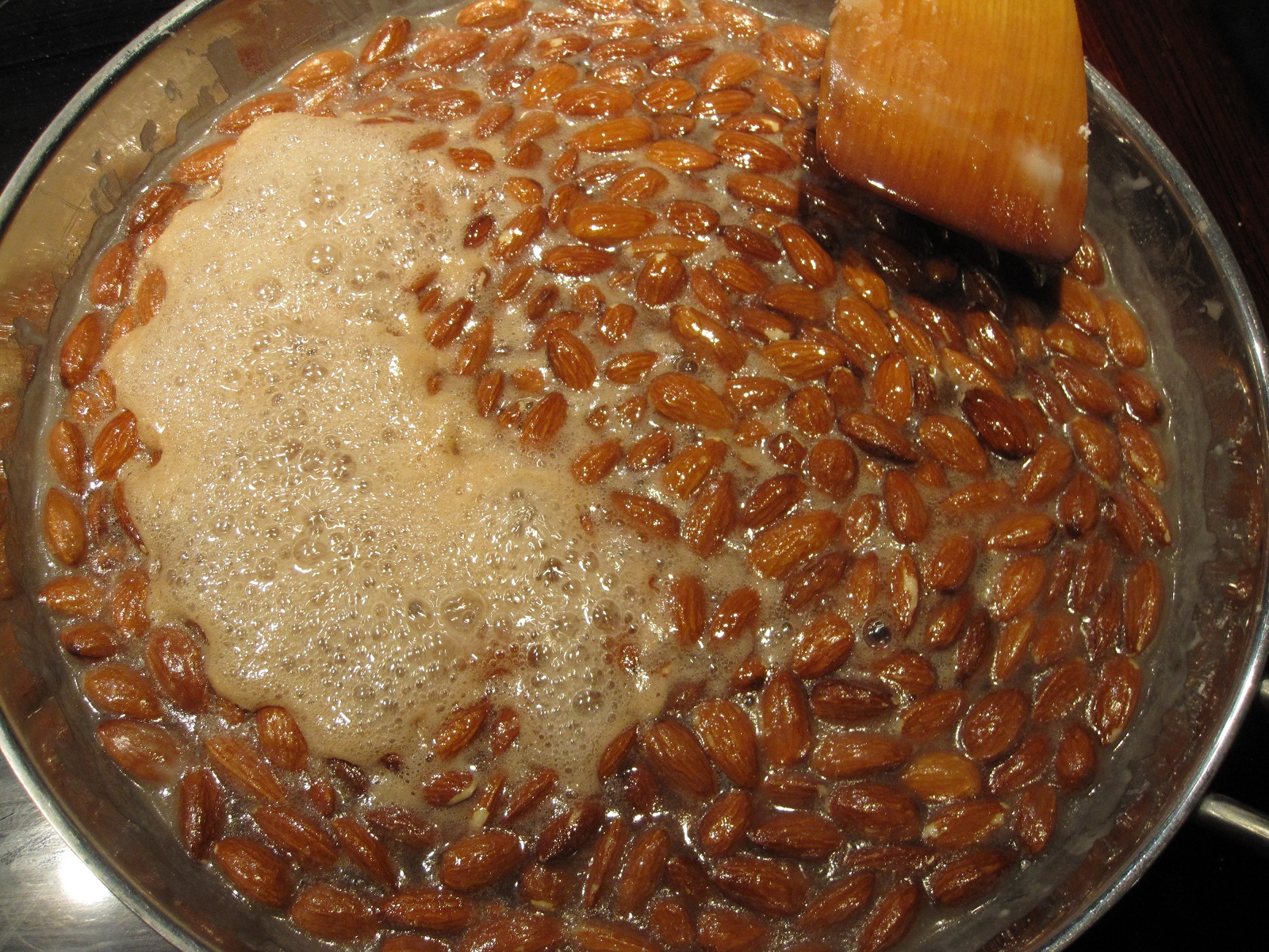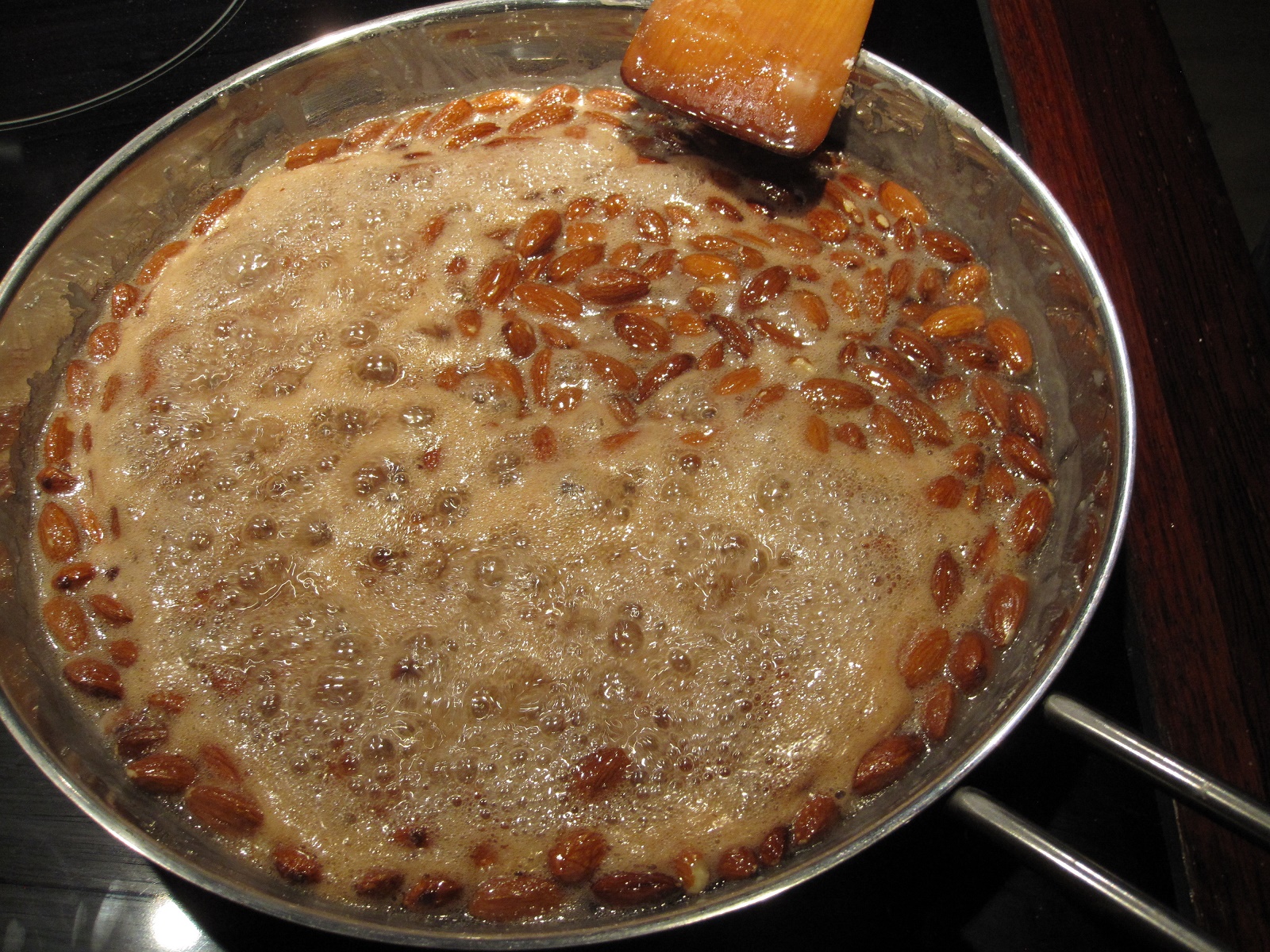 Herfra bliver man ved med at røre i mandlerne, indtil sukkeret igen begynder at smelte og blive lysebrunt.