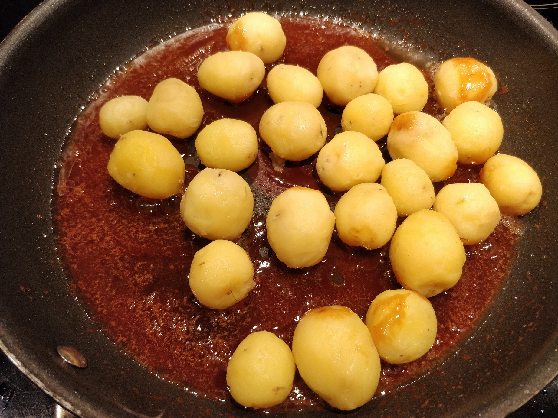 Når man ligeså stille kan få arbejdet smørret og karamellen sammen, kan man tilføje kartoflerne. Bare hæld dem op i karamellen på panden, og lad dem så ligge lidt, uden at røre ved dem. Hvis man starter med at røre i det med det samme, kan man komme til at køle hele karamellen af, så det bliver stift. Man kan godt rede det igen, hvis man skruer ned for varmen, og lader det stå og smelte igen, men det tager altså noget ekstra tid.