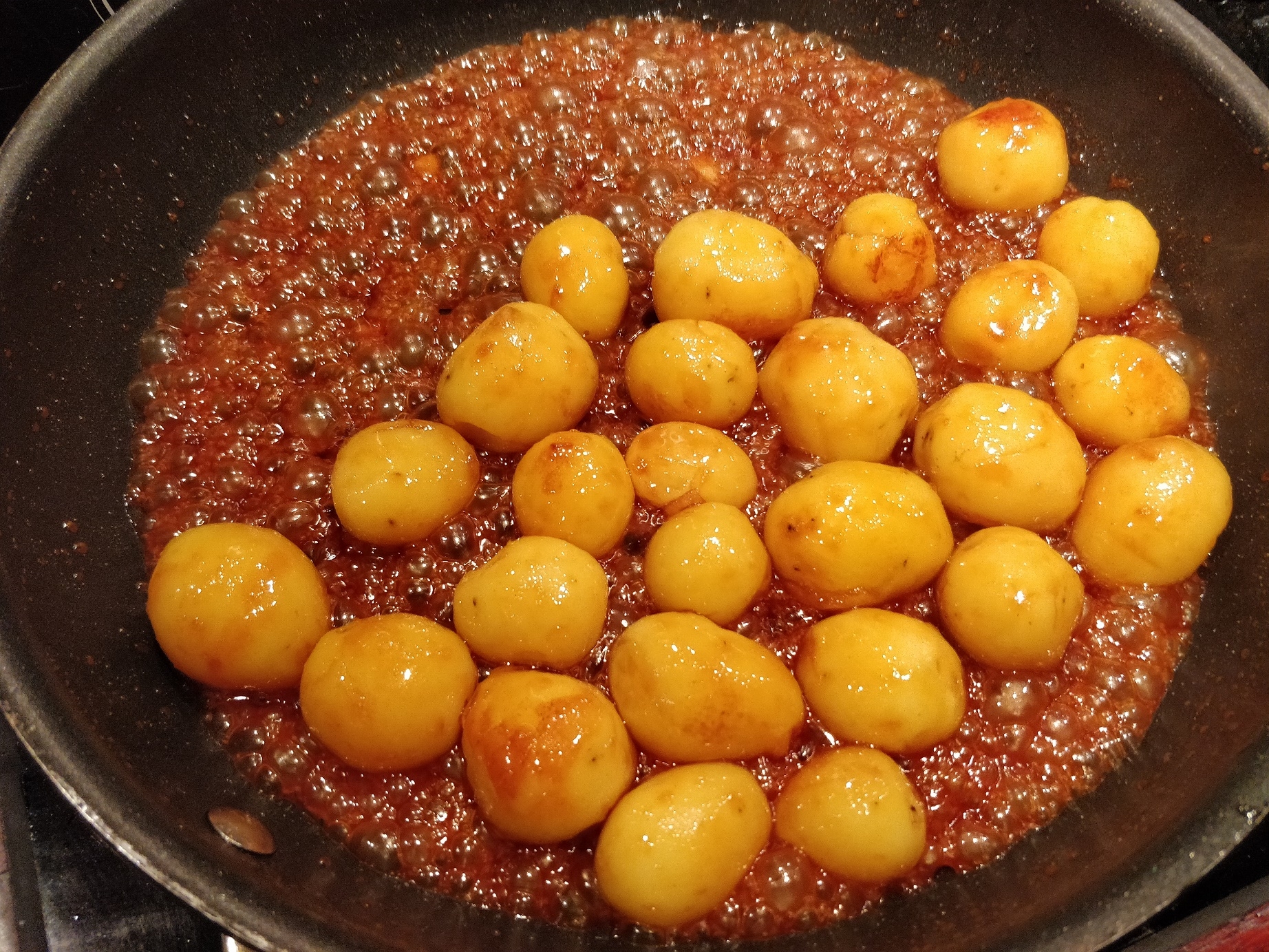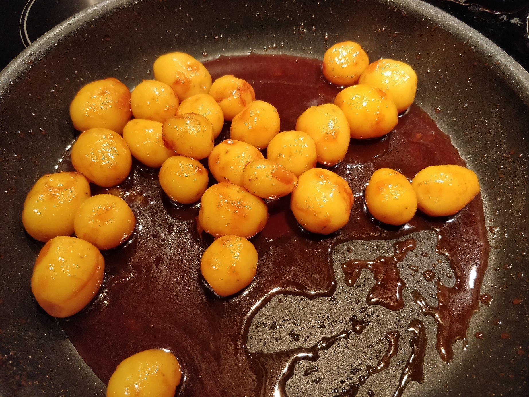 Når man kan fornemme, at kartoflerne begynder at blive varmet lidt op, og karamellen ikke er størknet omkring dem, kan man vende dem rundt, så de bliver dækket. Men ikke noget med at røre voldsomt. Kartoflerne kan nemt blive hakket i stykker, og vi vil jo helst have, at de er hele og fine. Så de skal altså bare lige vendes rundt i karamellen nogle gange, så de er dækket, imens de får lov at blive helt gennemvarme.