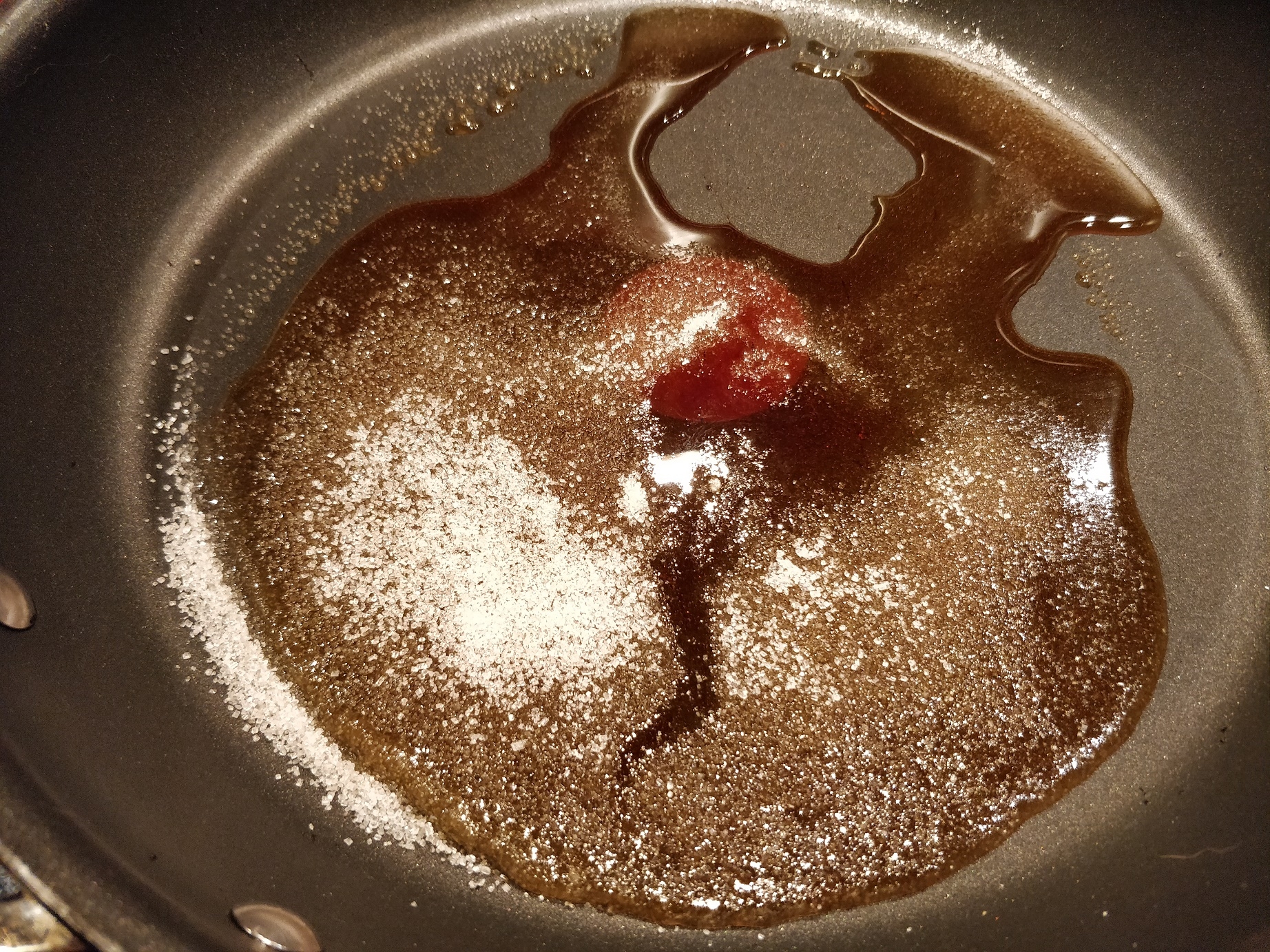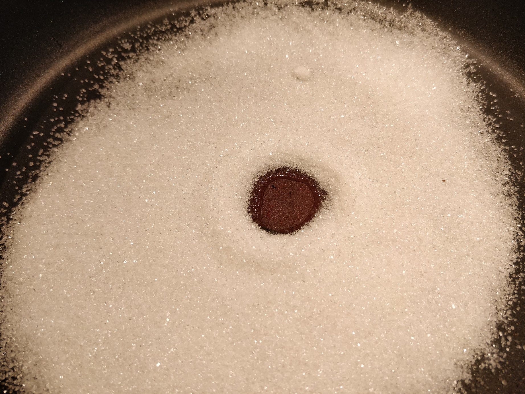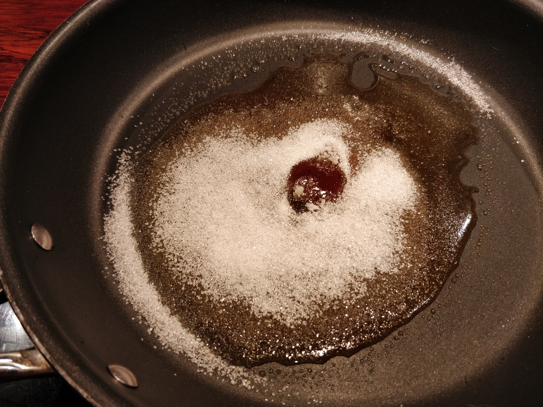 Først hælder man sukkeret på en pande, og tænder ved lav til middel varme. Jeg kan godt lide at lave en lille fordybning i midten af sukkeret, så jeg kan holde øje med, hvornår det begynder at smelte. Hvis det går for hurtigt, skal man skynde sig at skrue ned, for det må selvfølgelig ikke brænde på. Derudover skal man ikke røre i det. Det skal bare have lov at stå og smelte og karamelliserer ligeså langsomt.