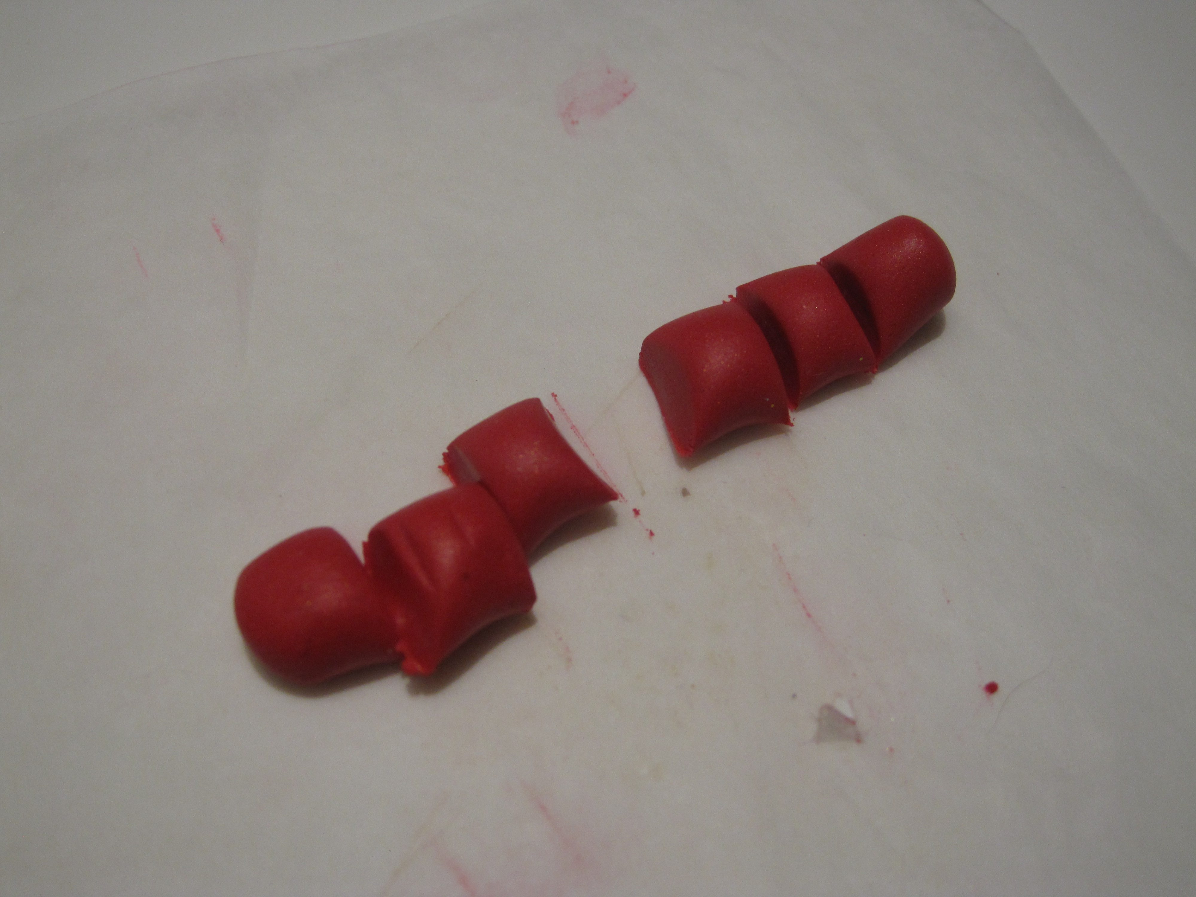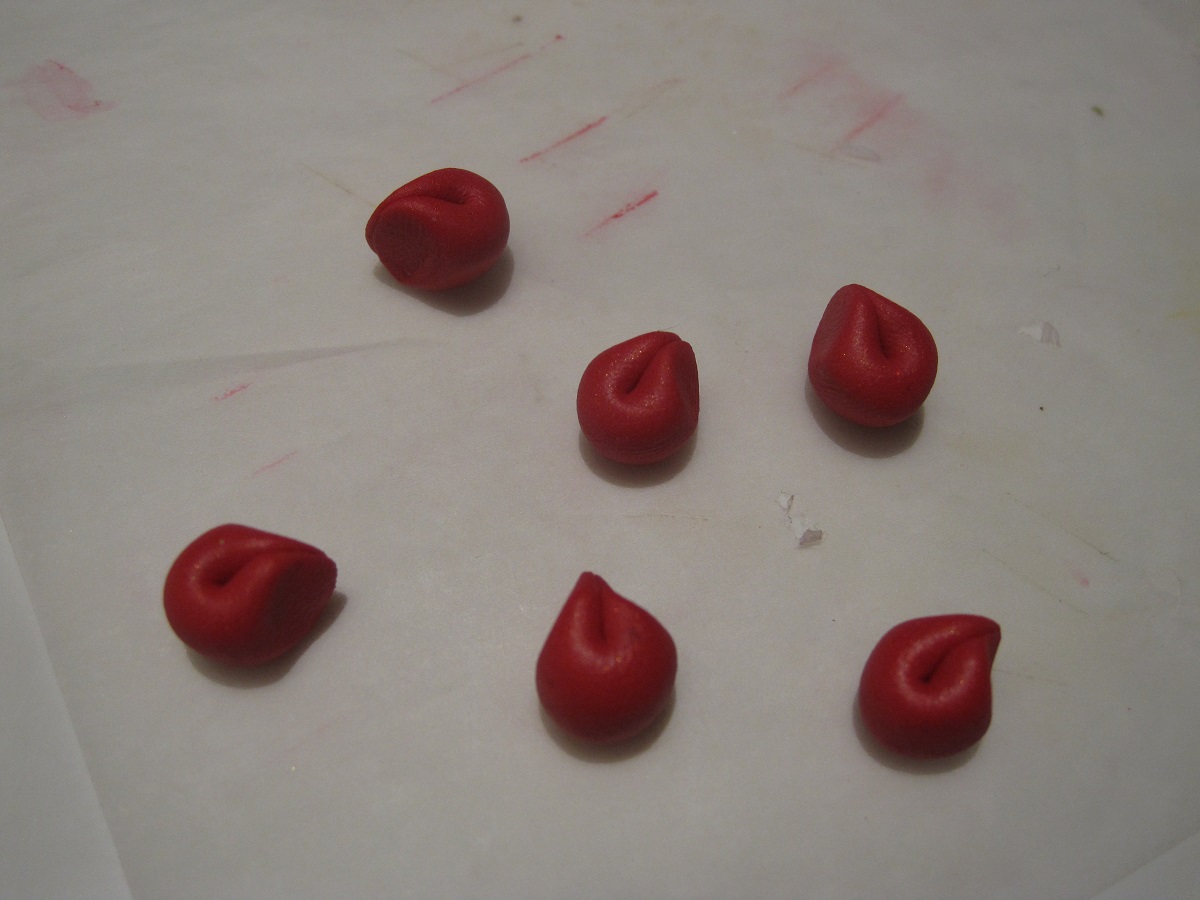 Lerklumpen deles i 6 lige store stykker, som hver trilles til en kort pølse. Hver pølse trykkes så sammen på midten, så samlingerne danner en lille spids. Disse små dele samles så, med spidserne indad, til en blomst.
