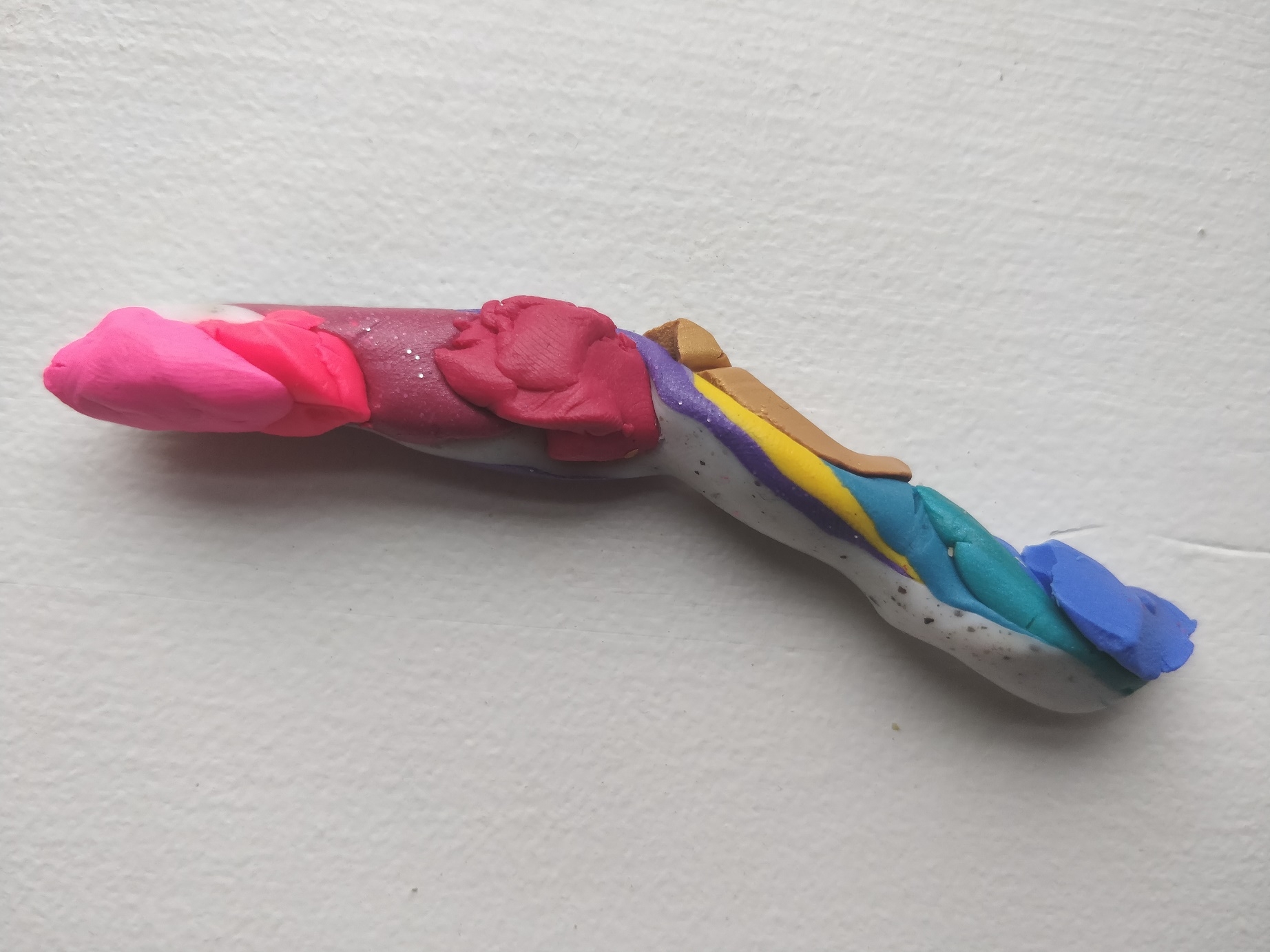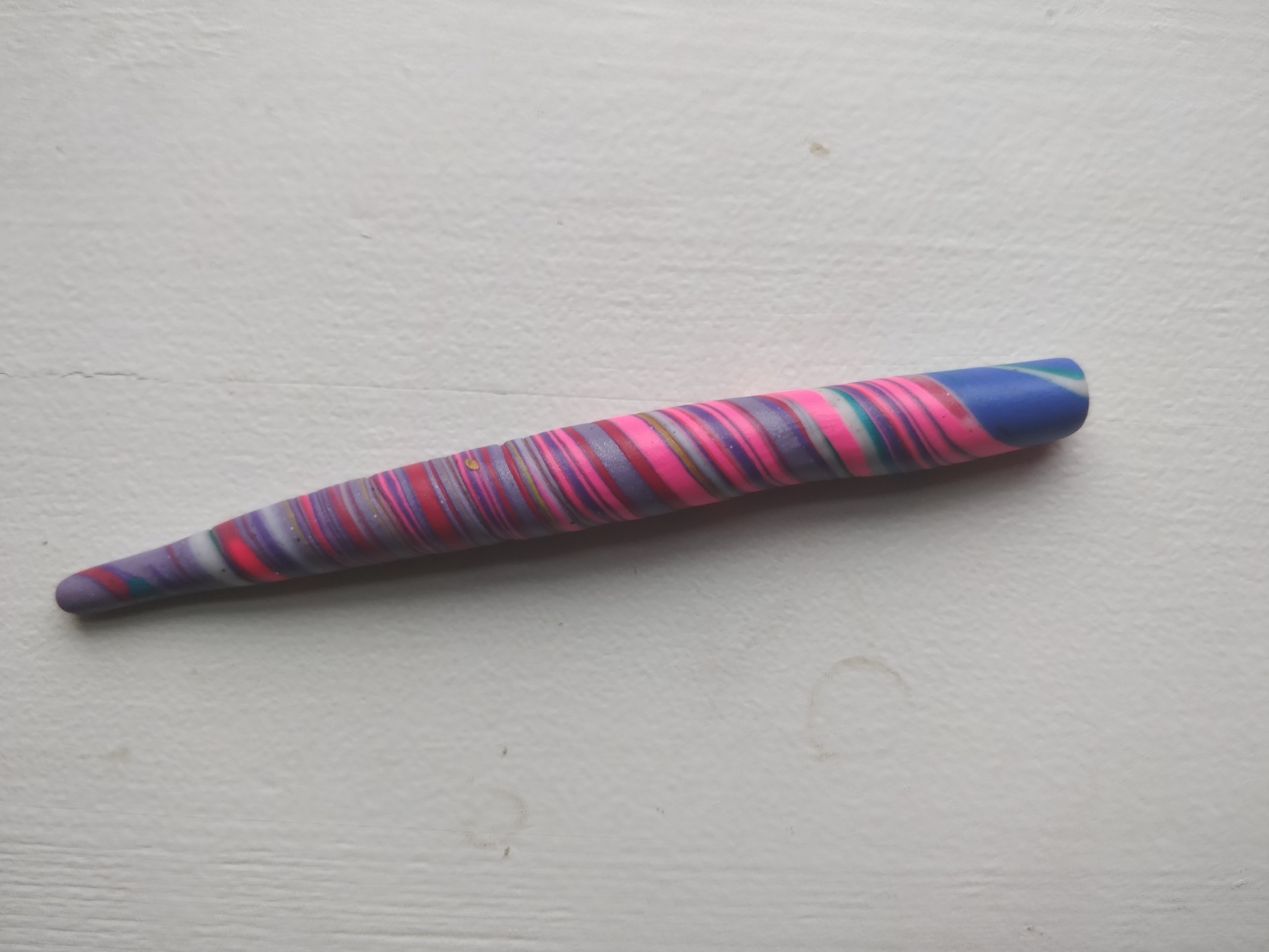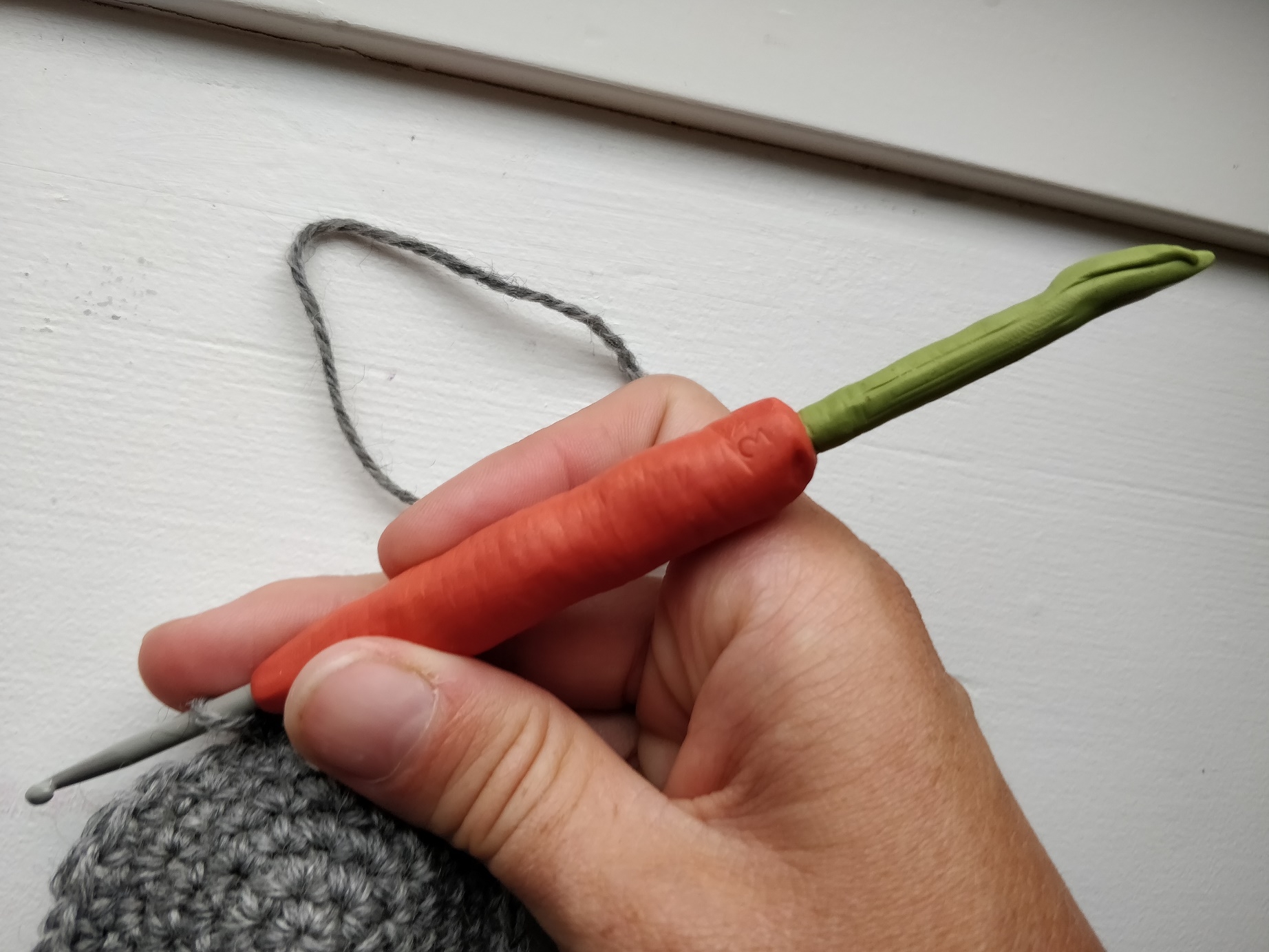De her hvor lerklumpen er formet efter ens eget greb, sætter man bare en klump ler på hæklenålen, i ønsket farve. Så trykker man den lidt i sit greb. Hækler lidt forskellige masker med den, for at se hvordan fingrene flytter sig. Så kan man sørge for, at den er rigtig rar at holde på, og til sidst glatte den lidt ud, så den også bliver fin. Man kan selvfølgelig lave den så kort eller langt op af bagenden af hæklenålen, som man synes. 🙂