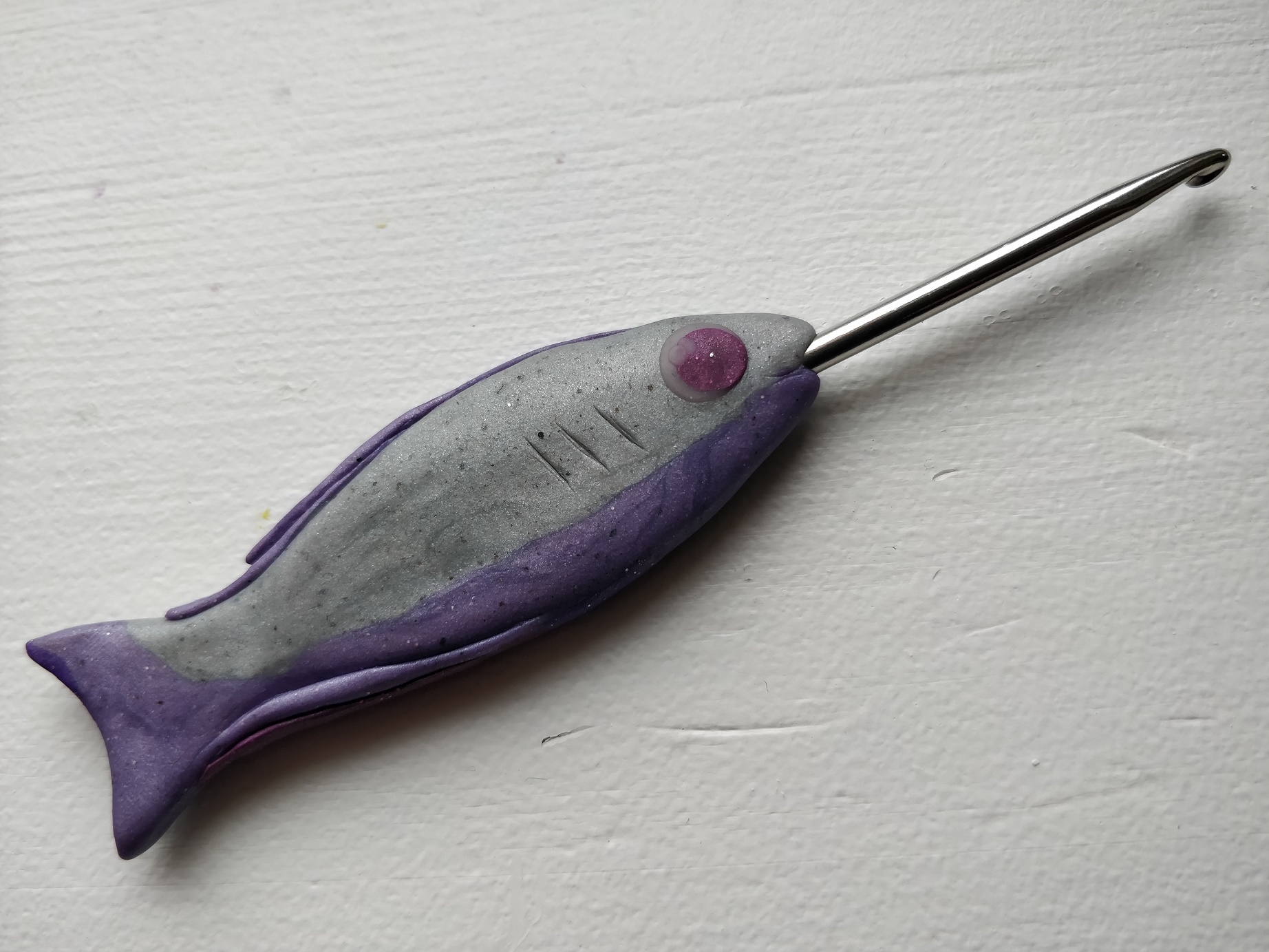 Som en sidste detalje, er det en rigtig god ide, at markere et sted på det nye greb, hvad størrelse hæklenålen er. På min fisk har jeg valg, at markere det med de tre gæller. På nogle af de andre har jeg taget en anden hæklenål, med et tilsvarende tal, og presset ind i. Det bliver selvfølgelig spejlvendt, men det er da til at se. Man kan også købe et punsel- eller stempelsæt med tal, hvis man synes det skal være rigtig fint. 🙂