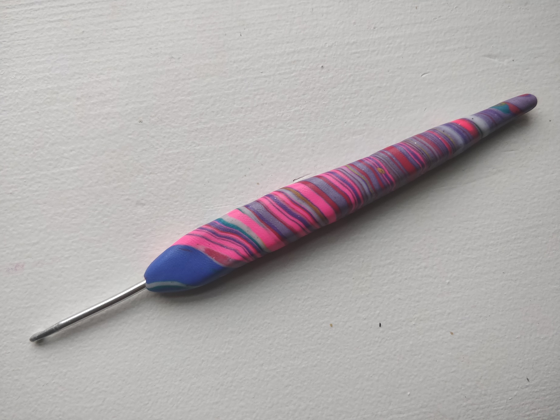Jeg har tre versioner af ergonomiske hæklenåle, med hjemmelavede greb, her. Den super dekorative, i form af en fint modelleret figur. I dette tilfælde en fisk og en gulerod. Den lidt nemmere, men stadig dekorative. Her med et “pink galaxy”-agtigt design. Og den helt simple, som er en blop ler, der er sat på hæklenålen, hvorefter man hækler lidt, så leret former sig efter ens eget greb.