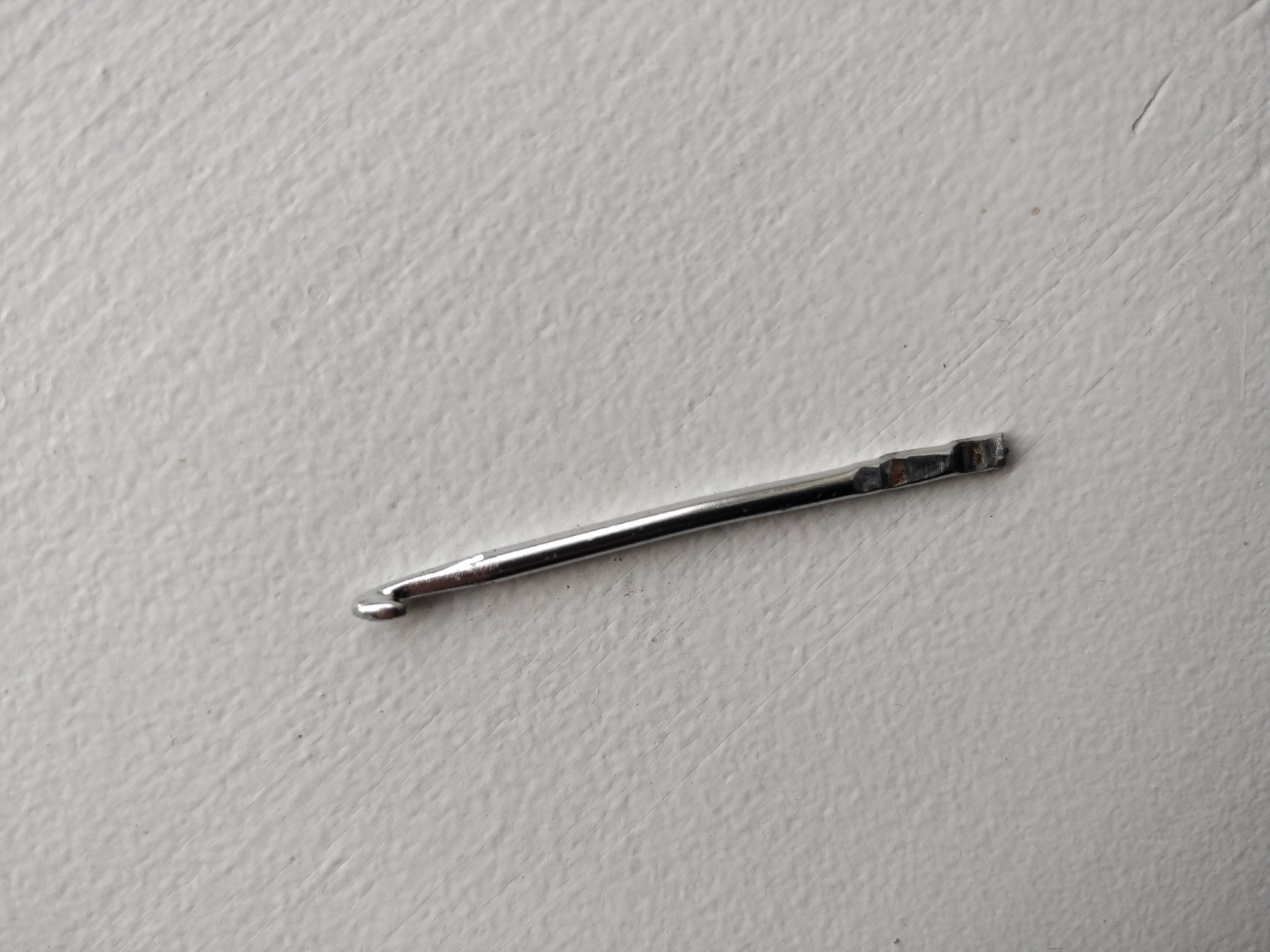 Har man en hæklenål med et plastikgreb, der er knækket, kan man også lave et nyt greb til denne. Hvis der sidder et stykke plastik tilbage, skal det selvfølgelig først fjernes. Derefter kan man, med fordel, lige give den et gok i enden, med en hammer, så den ikke kan glide ud af det nye greb.