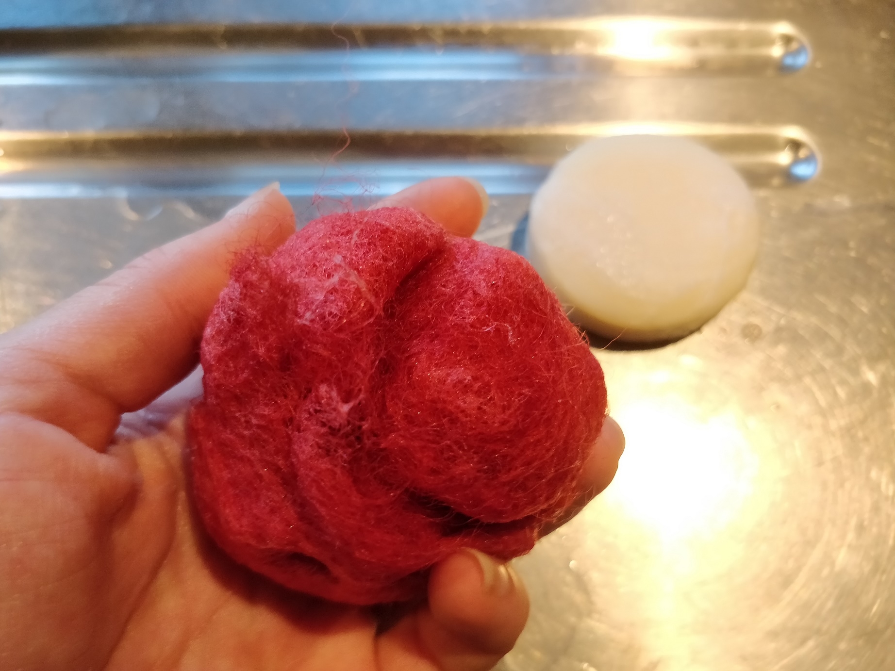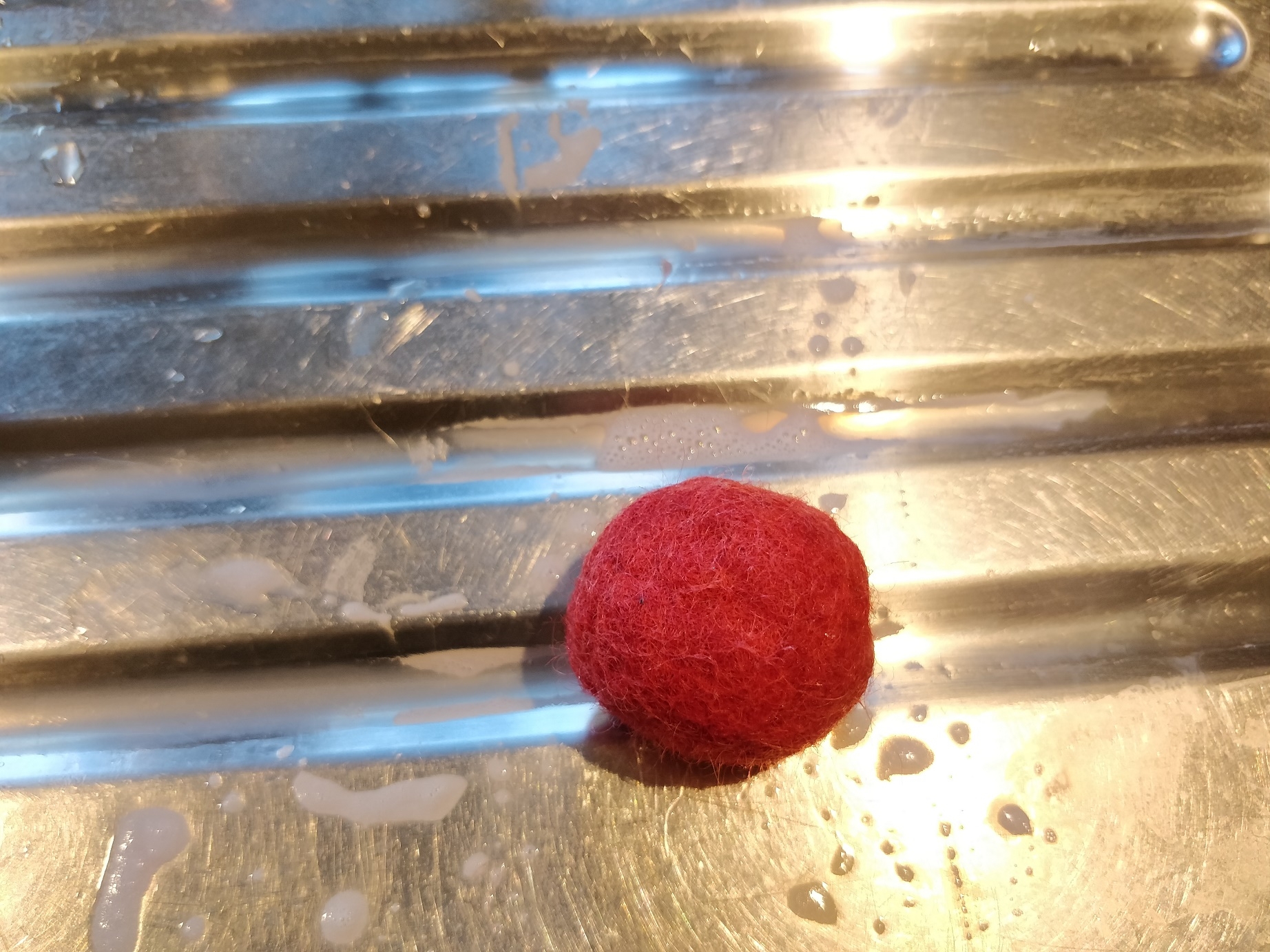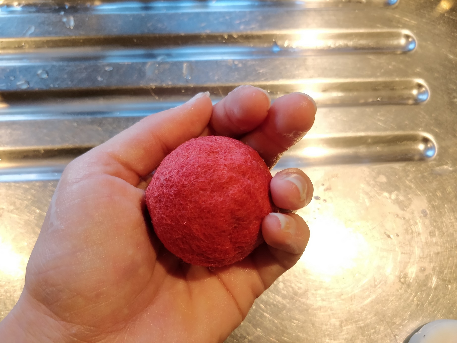 Når filtbolden er så tilpas lille og hårdt filtet, som man synes, den skal være, (Og de kan faktisk blive rigtig hårde!) skal sæben skylles ud, og så skal den bare have lov at tørre. 🙂