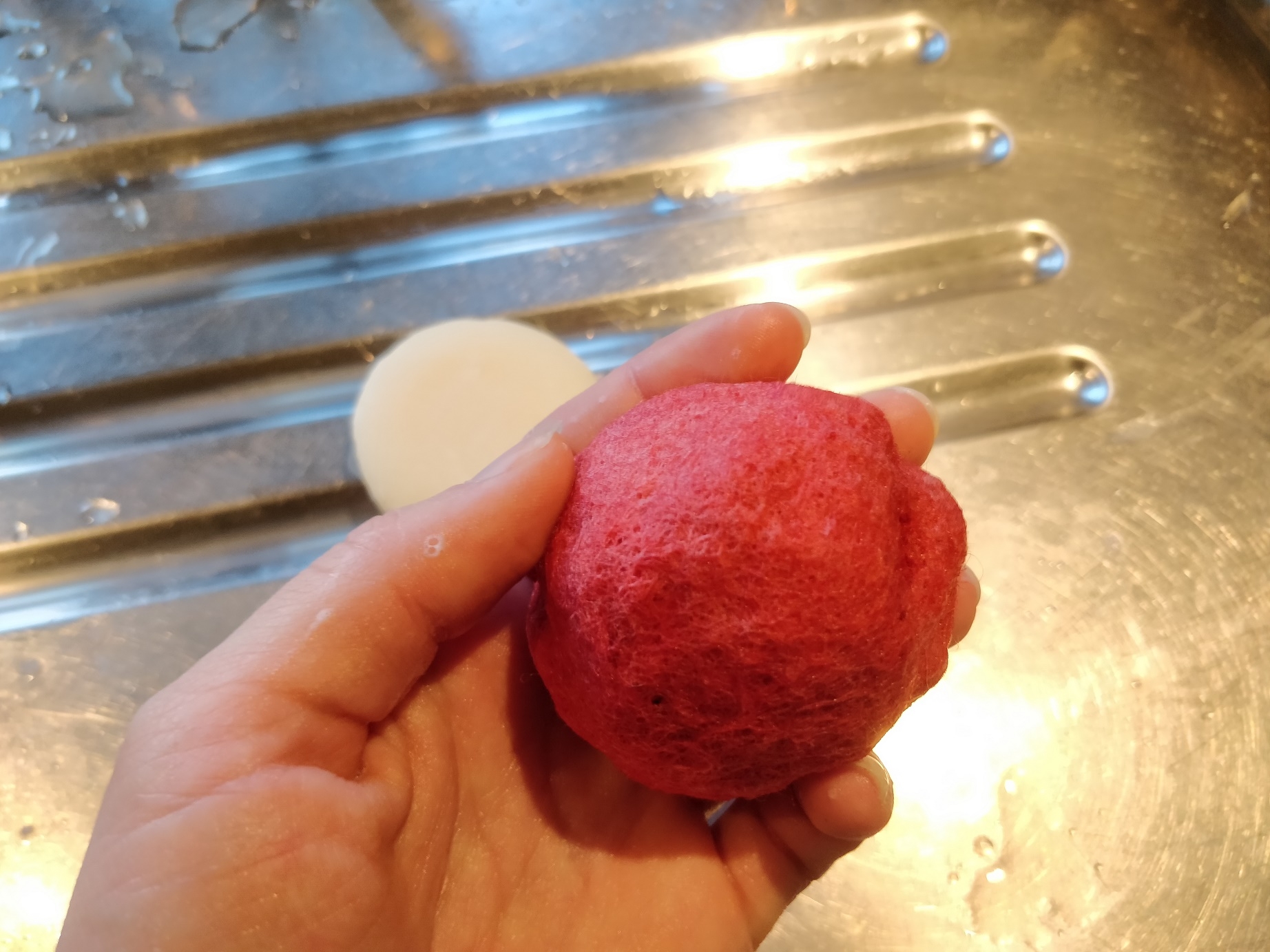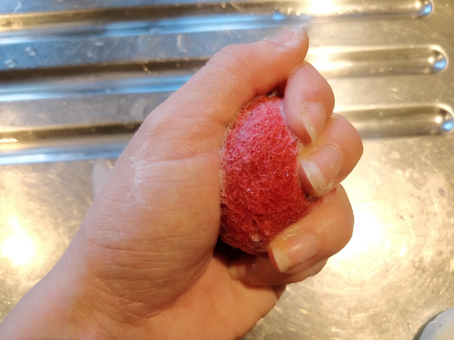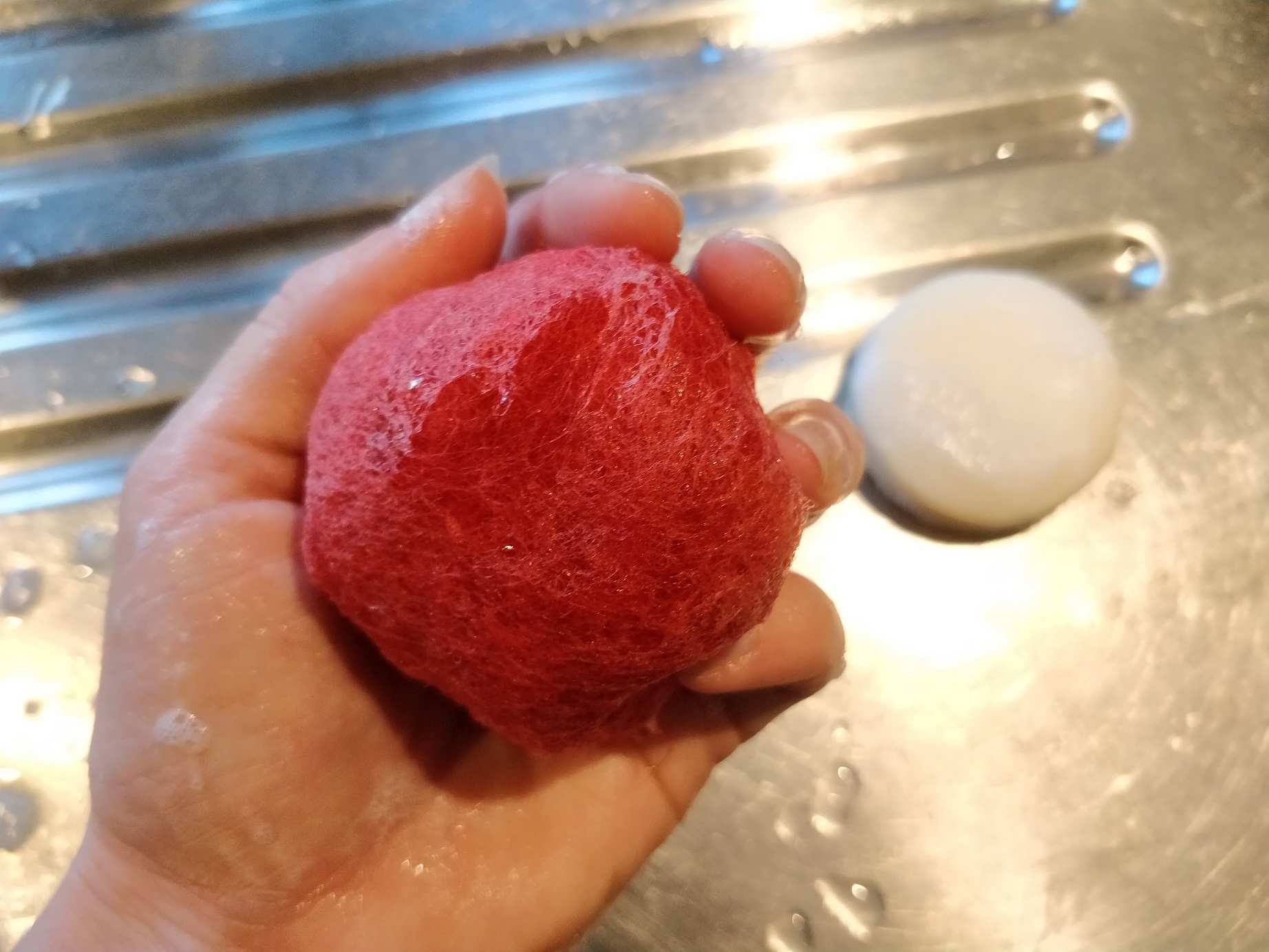 Når filtbolden er så tilpas lille og hårdt filtet, som man synes, den skal være, (Og de kan faktisk blive rigtig hårde!) skal sæben skylles ud, og så skal den bare have lov at tørre. 🙂