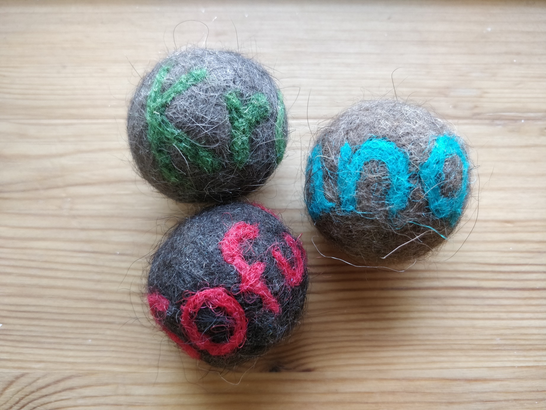 Man kan også nålefilte ting på sine filtbolde. Her har jeg lavet navn på bolde, der er filtet af pels fra mine hunde og katte! Man kan også nålefilte ansigt på, og måske bruge boldene som hoveder til engle eller nisser?