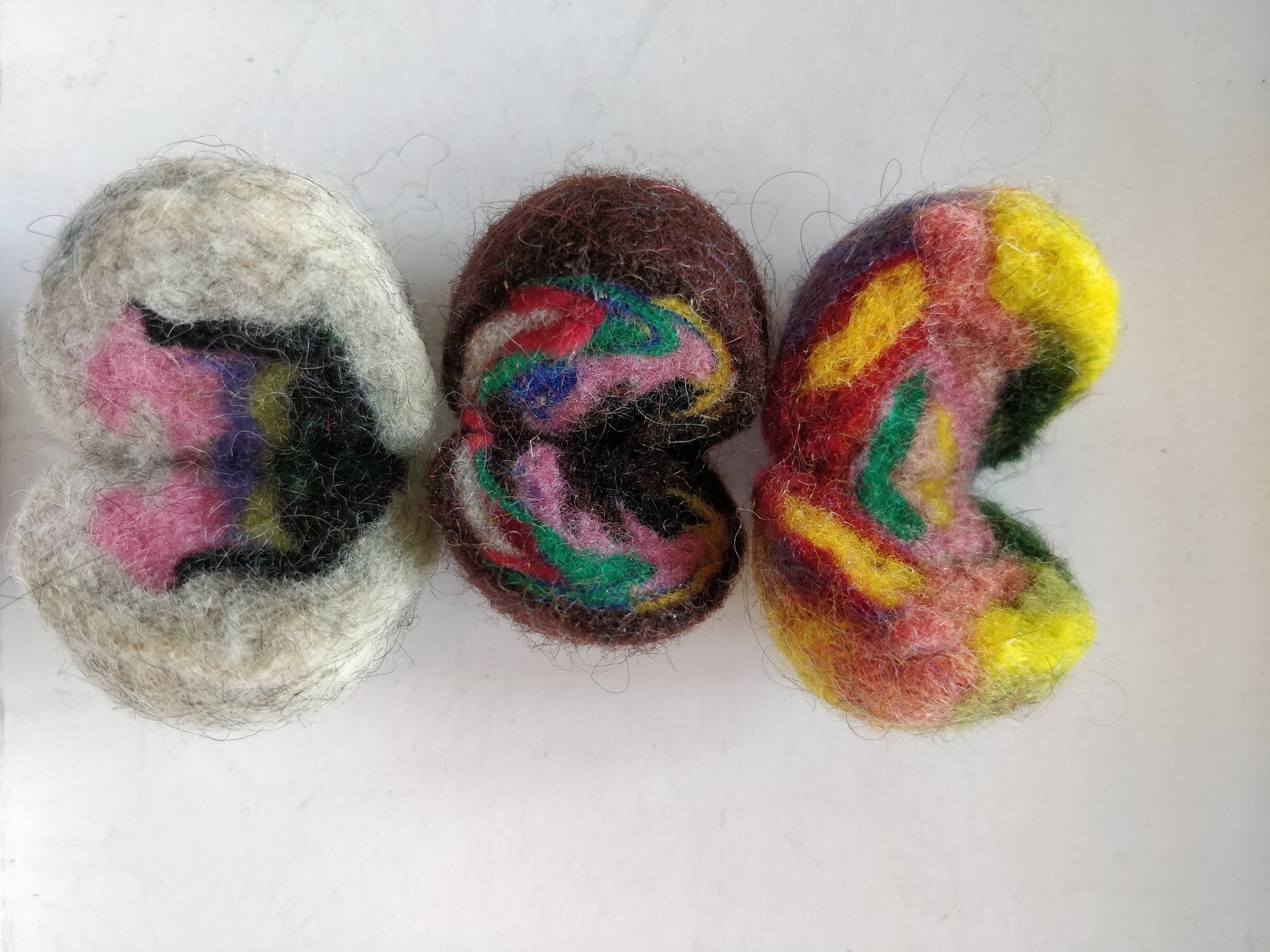 Åh, hvordan var det nu, de filtede bolde så ud inden i? Jeg må jo lige huske at vise, hvordan det kan se ud, hvis man blander en masse forskellige farver uld i en bold, og klipper den op! 😀