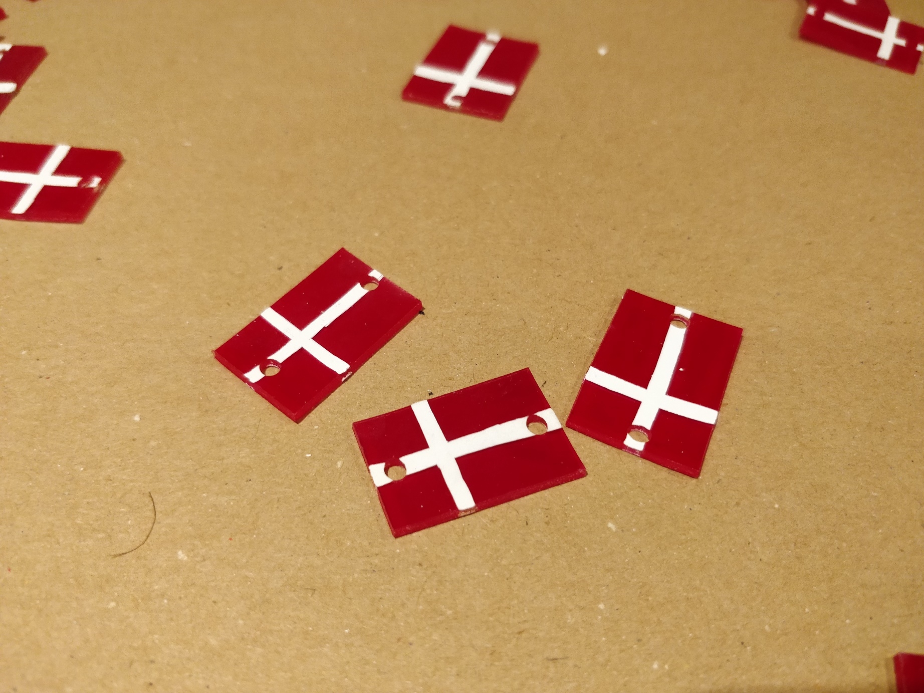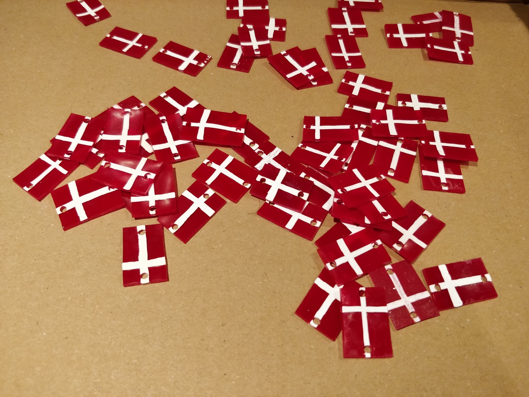 De første flag tegnede jeg enkeltvis, men fandt ud af, at det kunne gøres hurtigere, hvis jeg tegnede dem alle sammen op på et helt ark krympeplast, og klippede dem ud bagefter. Det kan godt betale sig, hvis man skal lave mange. Og man kan sagtens bruge en lineal eller noget andet andet, så det bliver lige. Det gjorde jeg ikke. 😉