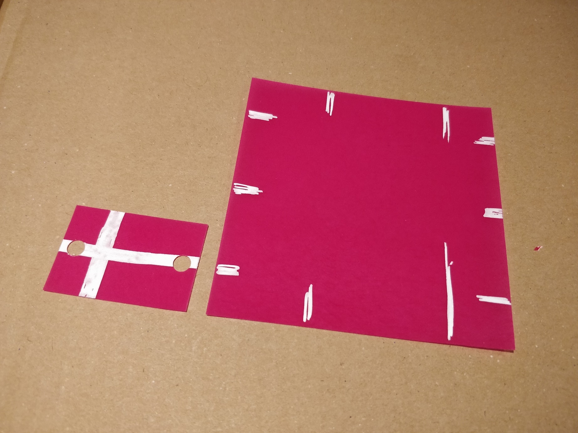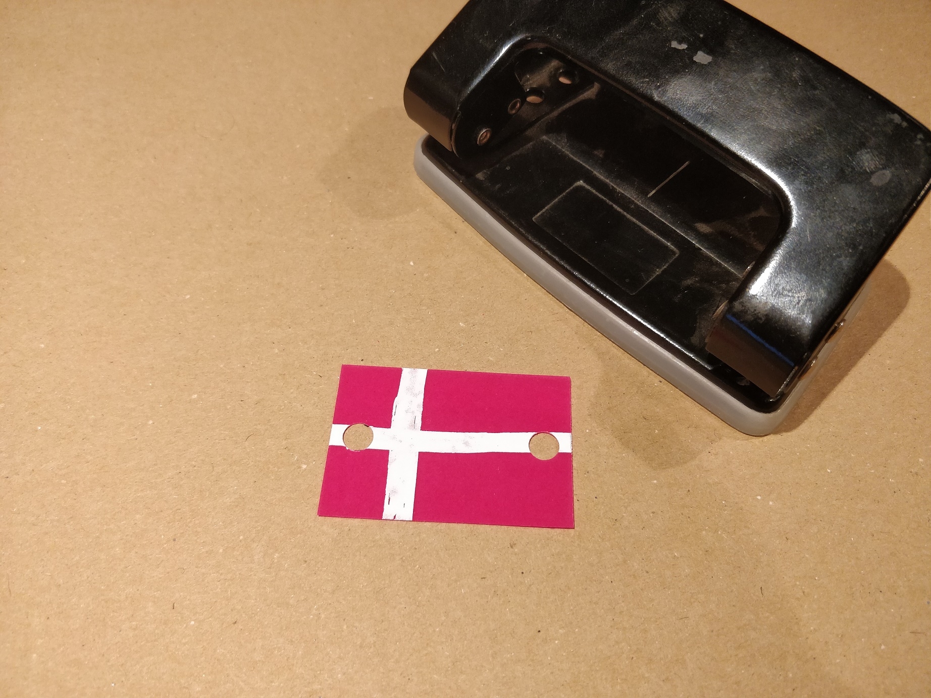 Hullerne i mine flag klippede jeg med en normal hullemaskine, et i hver ende. Jeg markerede først med en tusch, hvor hullerne skulle være, og så pillede jeg opsamleren af, så jeg kunne se prikken igennem bunden af hullemaskinen. Det gør det lidt nemmere at sætte hullerne, der hvor man gerne vil have dem.
