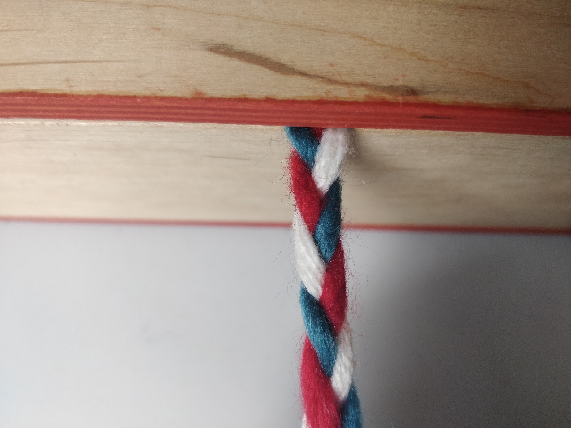 De tre snore bindes sammen med en knude i den ene ende, og så kan det være en god idé at sætte enden fast til et eller andet, så man kan holde snorene stramme og flette jævnt. Man kan f.eks binde en anden snor omkring knuden og binde om et bordben. Her har jeg sat knuden fast i en skuffe. Det kan man også. 😉