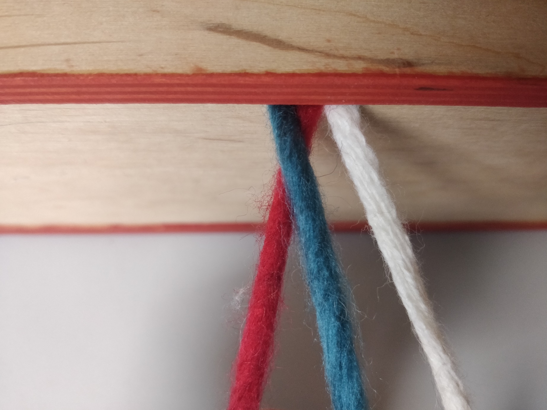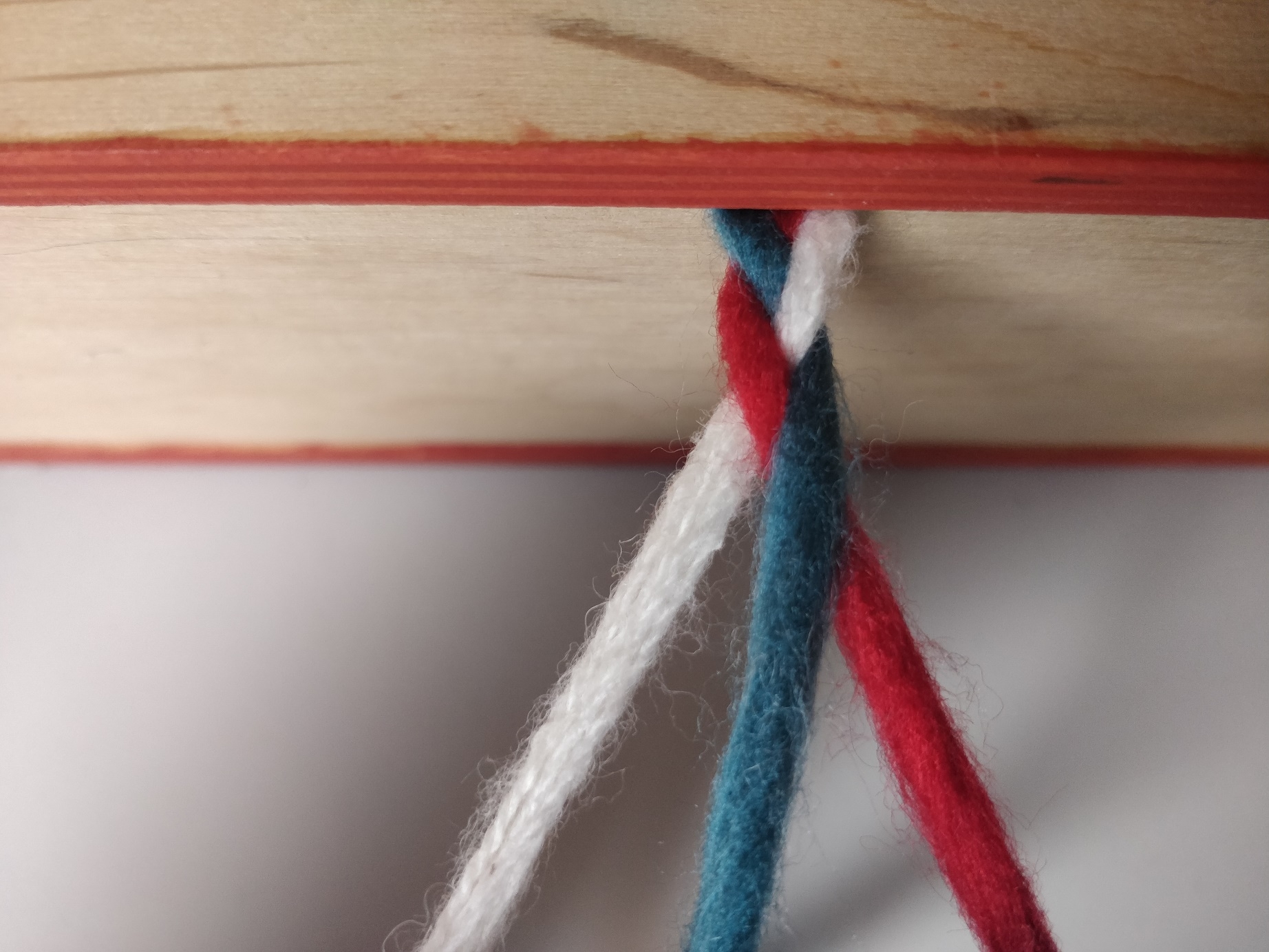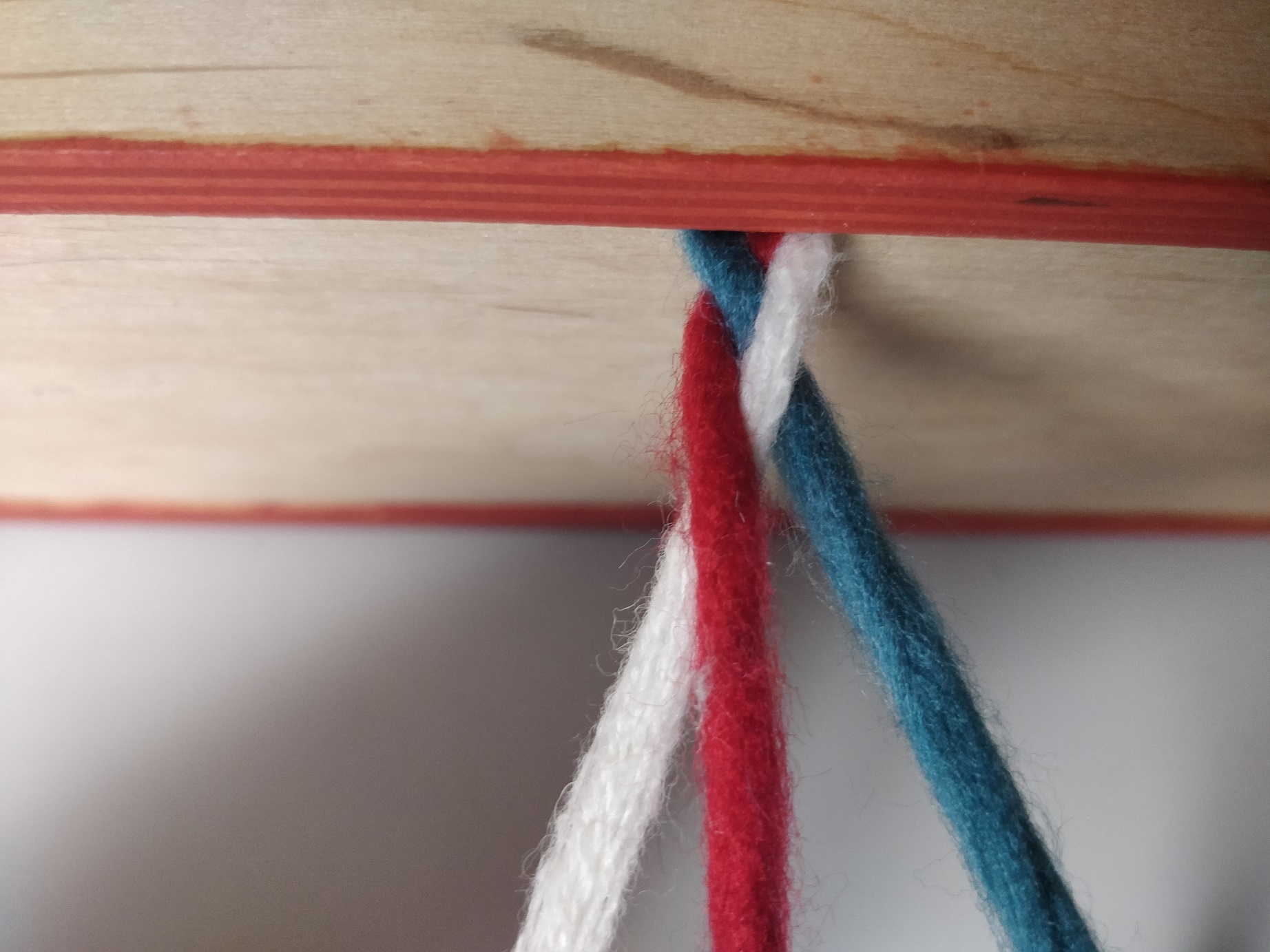 Man starter med en snor i hver hånd og den midterste et sted imellem. Så tager man først den ene af de yderste, her tager jeg den blå til venstre, og lægger ind over den midterste snor. Så tager man snoren til den anden side, her den hvide til højre, og lægger ind over den der nu ligger i midten, altså den blå.