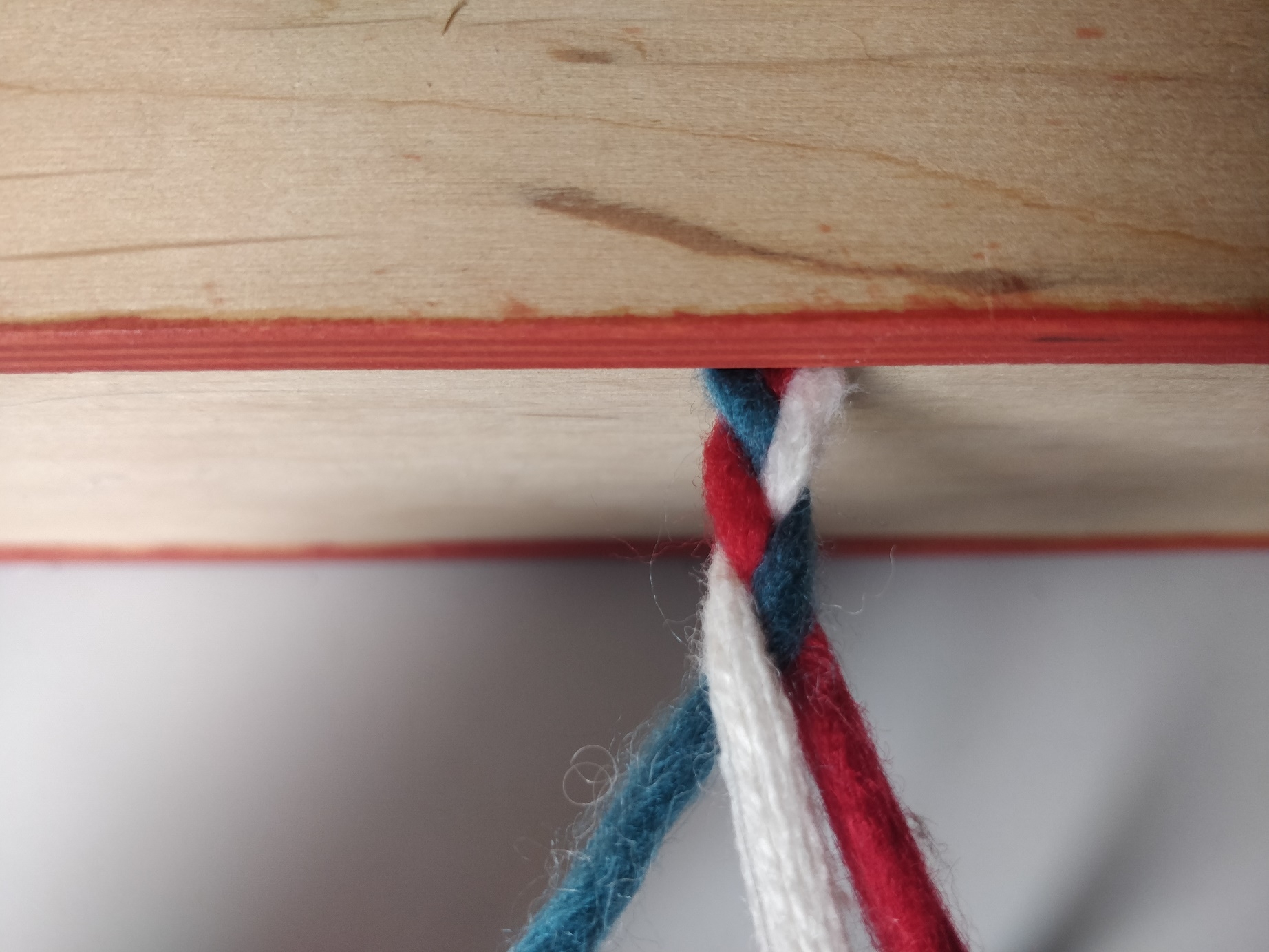 Så tager man den venstre og lægger ind over den midterste, den højre ind over den midterste, venstre ind over midterste, så den højre, og så fortsætter man bare, indtil man når enden af snoren, hvor man binder en knude mere.