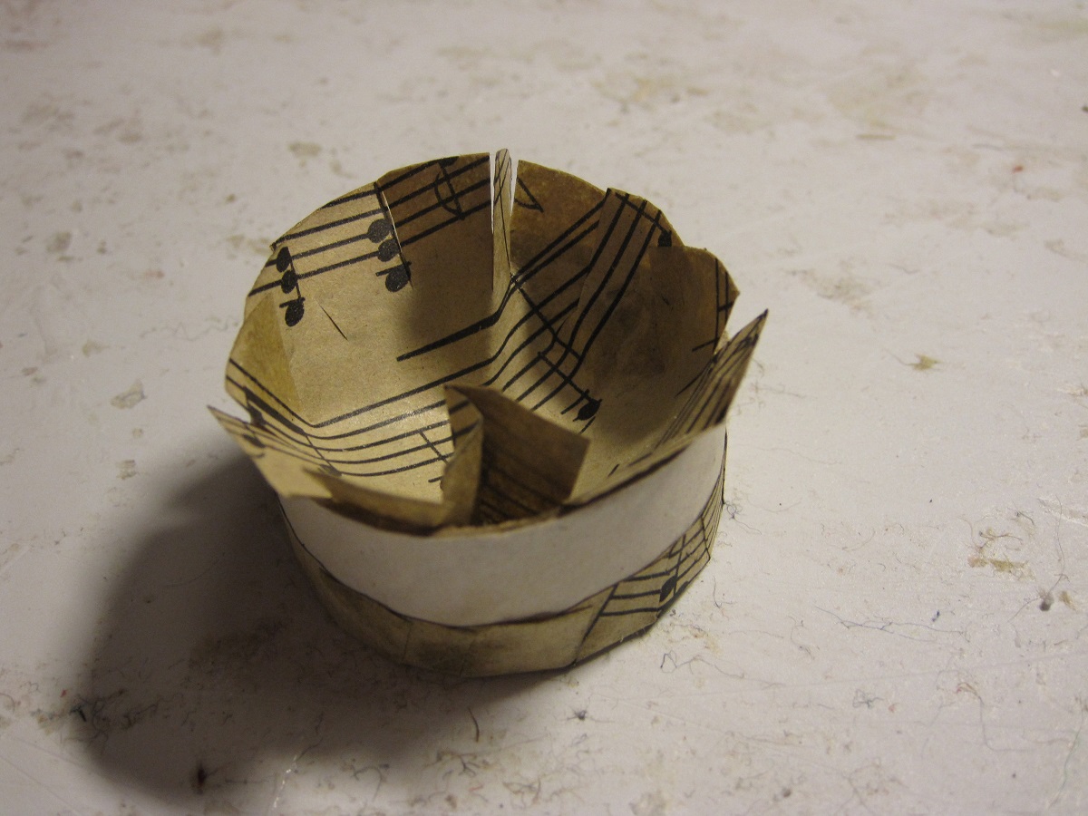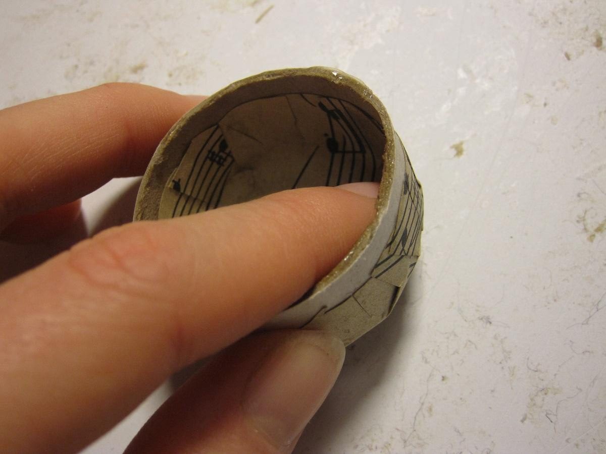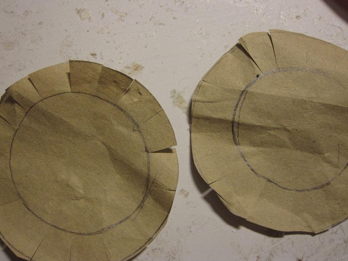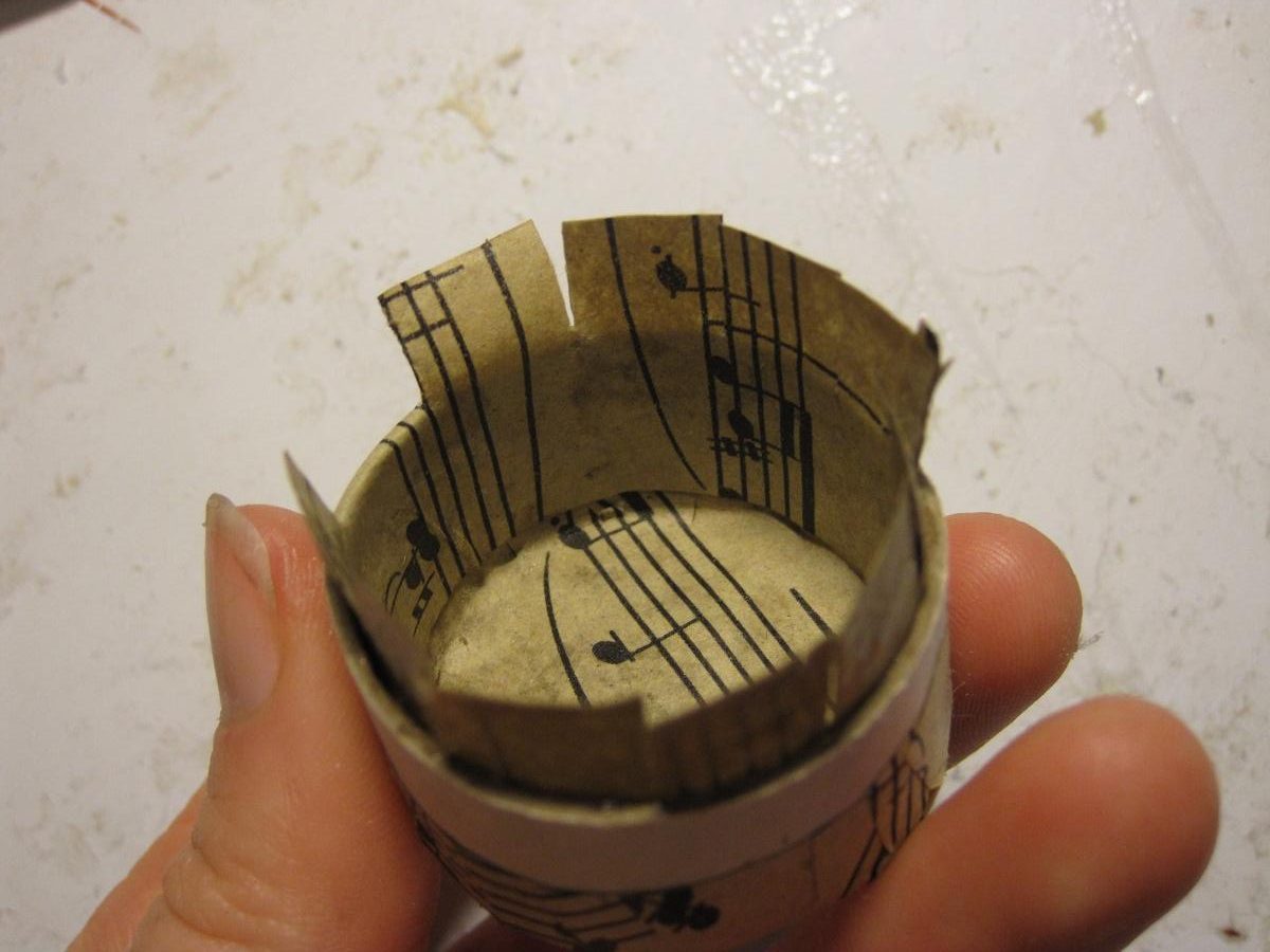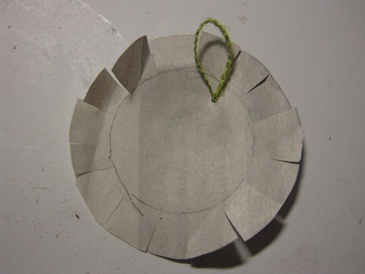 De to cirkler klippes der en masse små hakker ind i. Ind til cirklerne man har tegnet. Så pensler man lim i kanten, på bagsiden af det papirstykke, der skal yderst, sætter det på røret og folder alle kanterne fint op ad siderne.