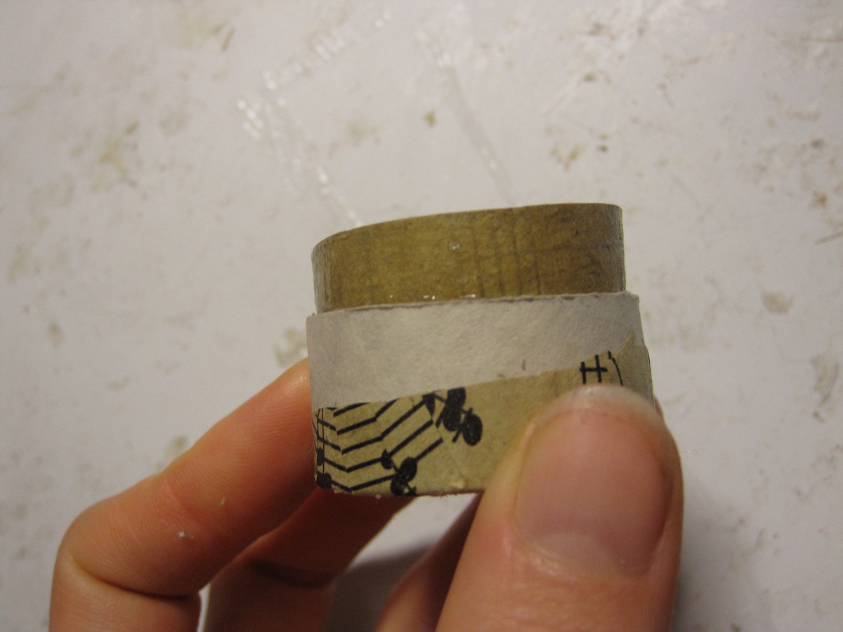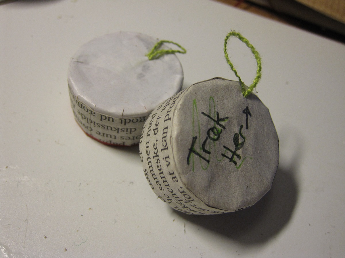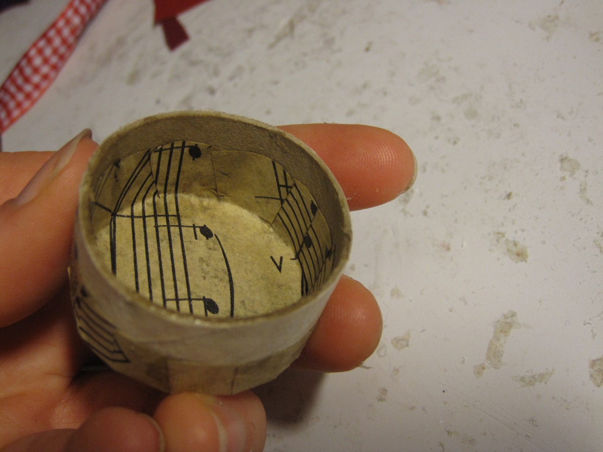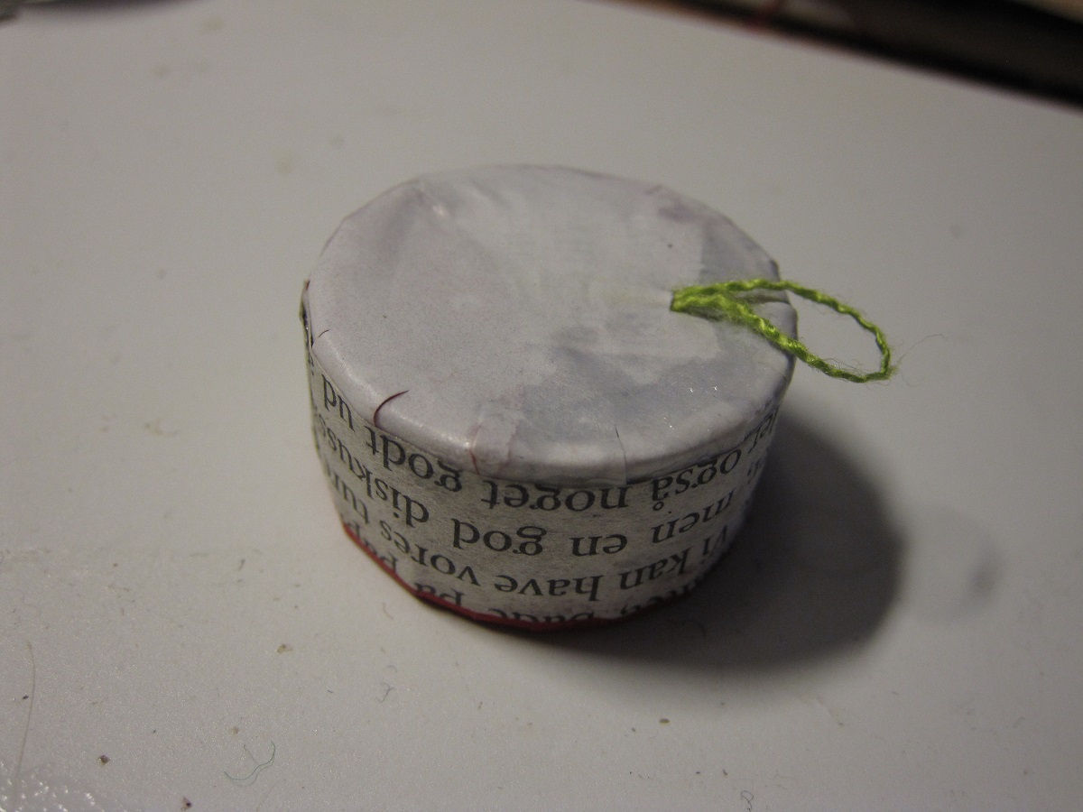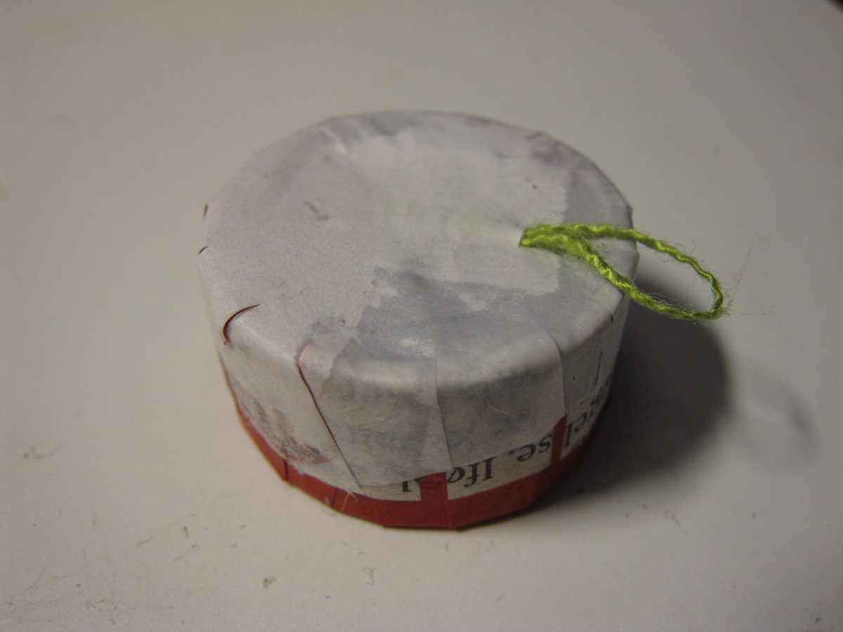 Den anden cirkel pensler man med lim på hele bagsiden, og så putter man den forsigtigt ned i røret, samtidigt med, at man sørger for, at alle flapperne sidder ordenligt. Så trykker man det hele godt fast, ud i alle kanter, gerne med en negl, eller noget andet let spidst, men forsigtigt, for bunden består jo kun af to lag papir, og så længe den er fugtig, vil den være en smule skrøbelig. Man kan godt forstærke den, med flere lag papir, eller en lille karton skive, hvis man synes, det er nødvendigt, men to lag bliver faktisk fint, når det først er tørt. Det vigtigste er, at hullet i røret er lukket. 🙂