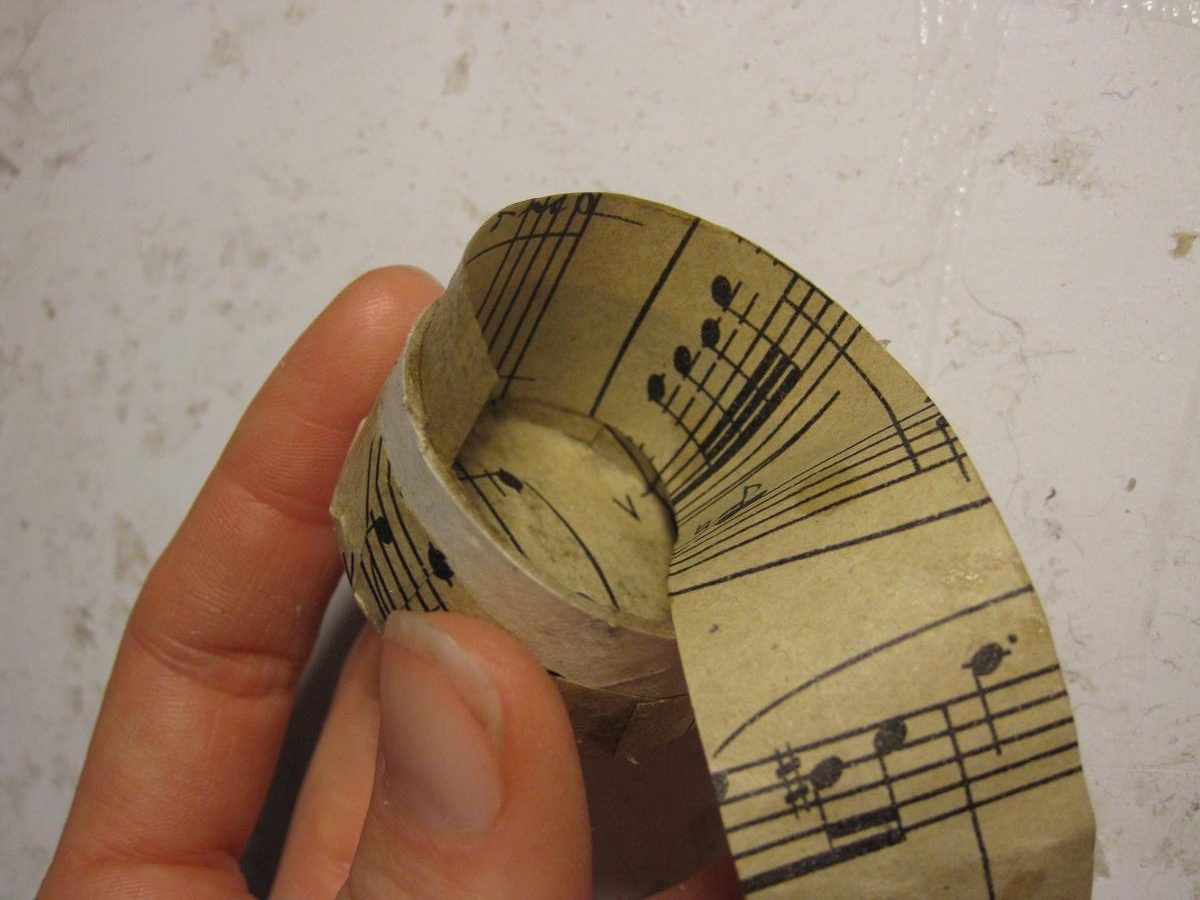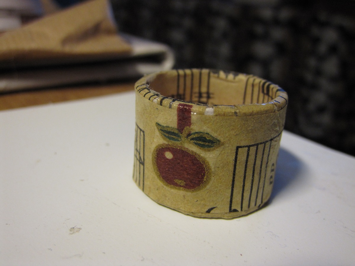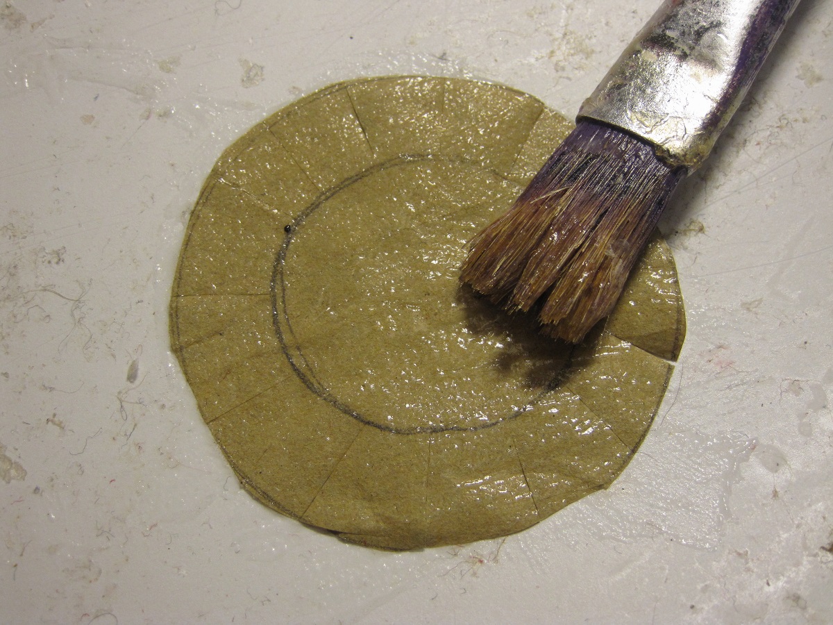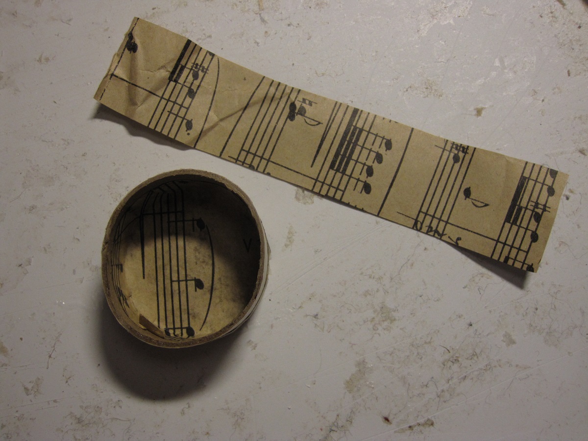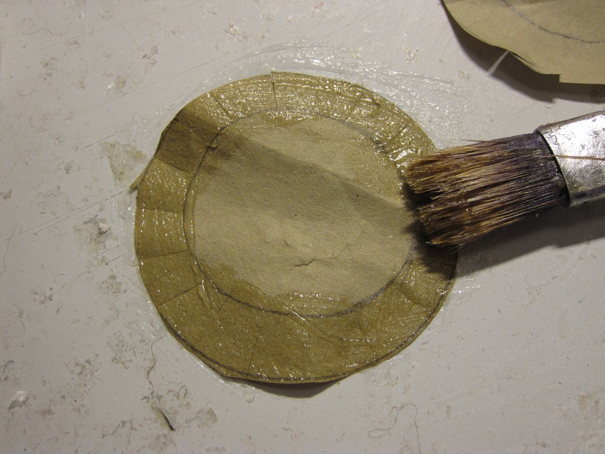 Den anden cirkel pensler man med lim på hele bagsiden, og så putter man den forsigtigt ned i røret, samtidigt med, at man sørger for, at alle flapperne sidder ordenligt. Så trykker man det hele godt fast, ud i alle kanter, gerne med en negl, eller noget andet let spidst, men forsigtigt, for bunden består jo kun af to lag papir, og så længe den er fugtig, vil den være en smule skrøbelig. Man kan godt forstærke den, med flere lag papir, eller en lille karton skive, hvis man synes, det er nødvendigt, men to lag bliver faktisk fint, når det først er tørt. Det vigtigste er, at hullet i røret er lukket. 🙂