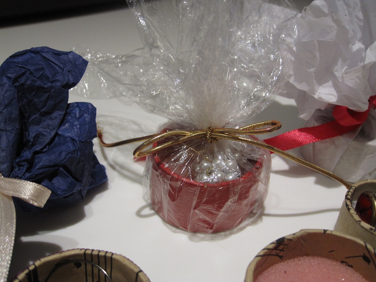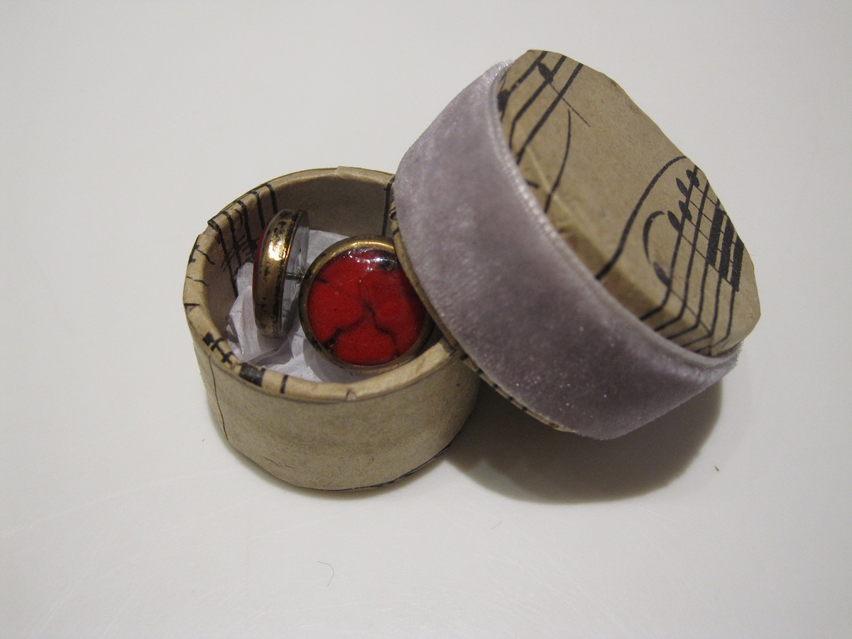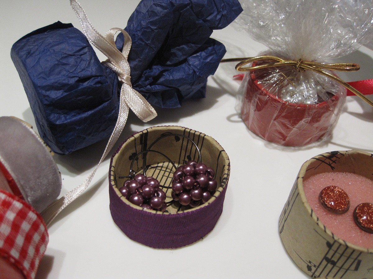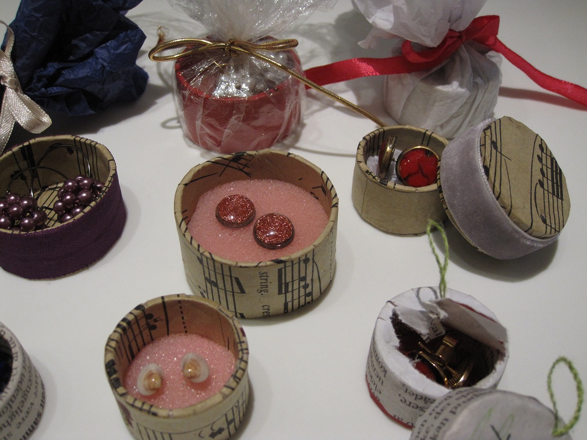 Æskerne er nemlig lavet af genbrugsmaterialer, i form af pap rør fra forskellige husholdningsting: Alufolie, husfilm/vita wrap, køkkenrulle, eller noget lidt større, som f.eks plakat rør. De er pyntet med små stykker gavepapir, avis, stof rester, bånd og lignende. Så de er altså ganske billige at lave, og de passer perfekt,til et par øreringe, eller et andet smykke, man kunne tænke sig at give i gave. 🙂