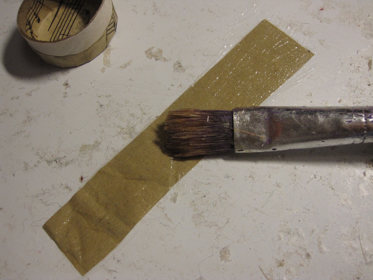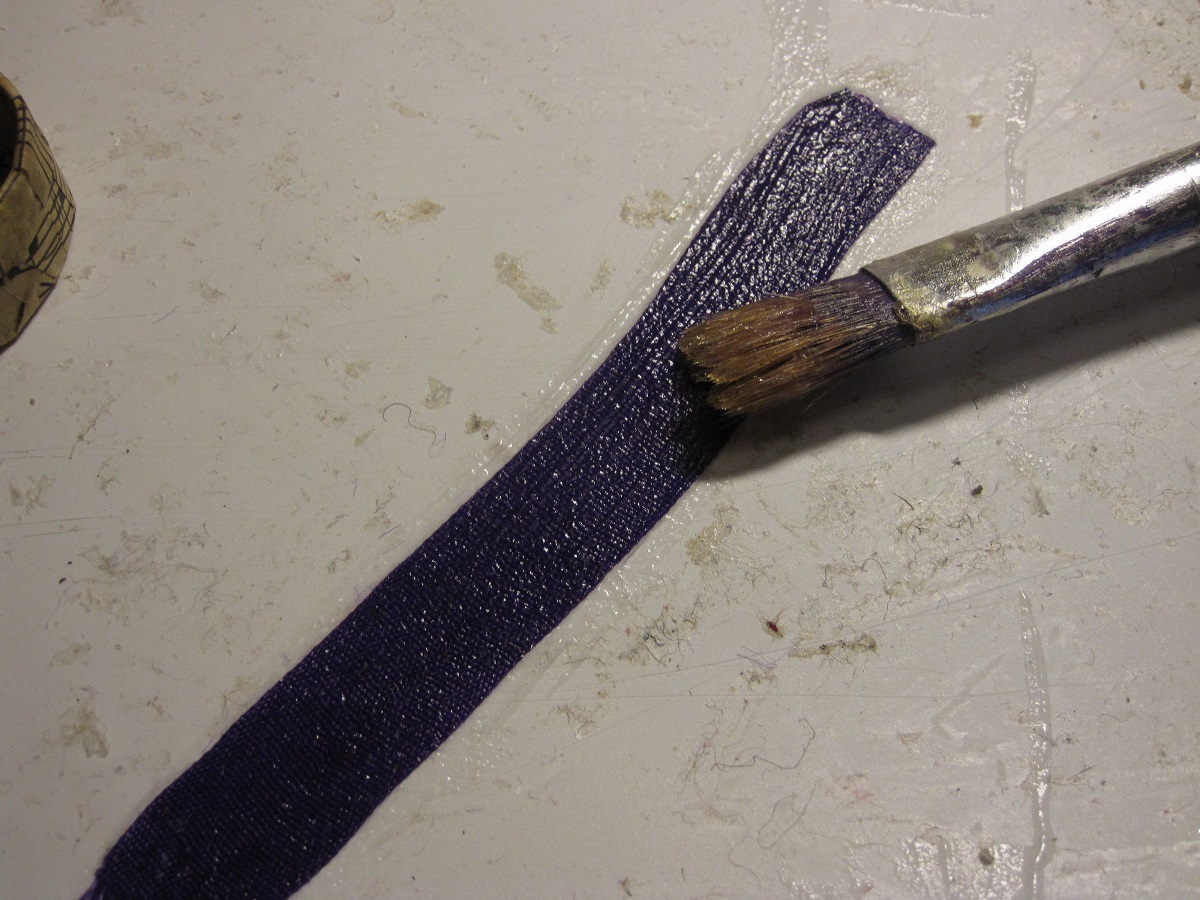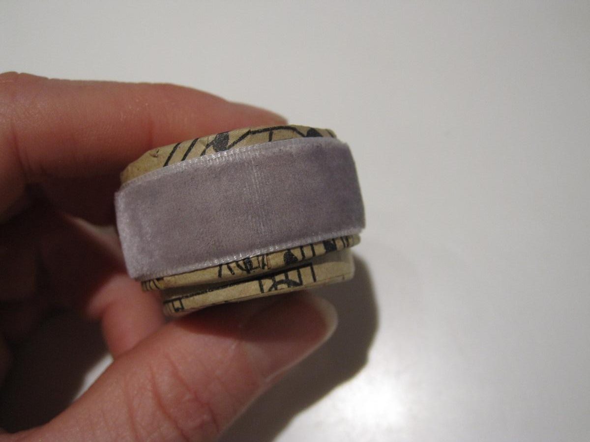 Når det er gjort, kan man dække ydersiden. Her har jeg valgt at bruge et stykke lilla bånd, der lige passede i bredden. Hvad man end vælger, om det er det samme papir, man har brugt tidligere, eller noget helt andet, så pensler man det med lim, og så beklæder man blot ydersiden.