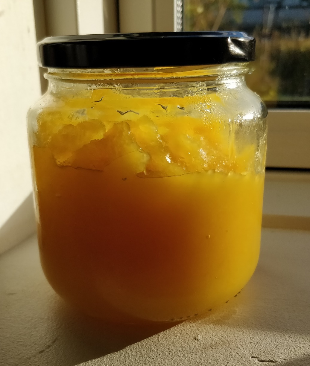 Så skal det bare hældes på et rent glas eller to og køles ned, også er det klar til at blive spist. Evt. på en skive græskar grydebrød, eller man kan bruge det i en græskarkage der er ligesom gammeldags æblekage.