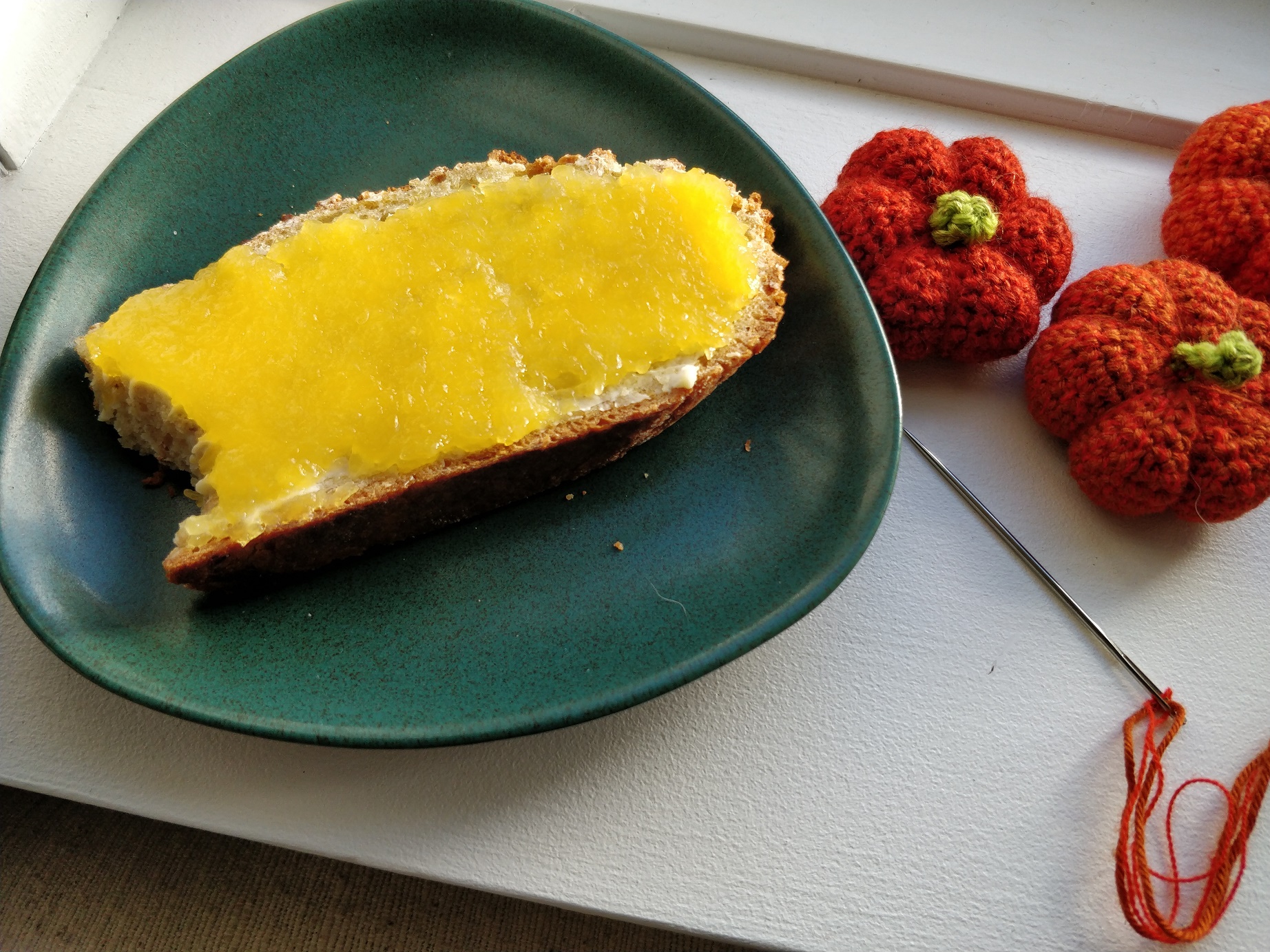 Det her græskar marmelade eller -mos kræver kun 3 ingredienser, så det er sindssygt nemt at lave! Det er faktisk overraskende lækkert, og det får den flotteste gule farve! En af ingredienserne er lidt af kødet fra et græskar. Så det er meget oplagt, hvis man har lavet et græskarhoved. 😀