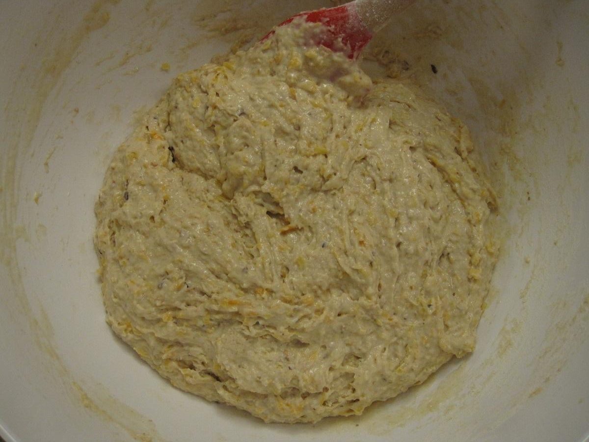 Derudover starter man med at opløse gæret i vandet. Her tilsætter man salt, græskar fyld og fuldkorns mel, og rører det sammen, så der ikke er klumper i. Så tilsætter man hvedemel, og rører dejen sammen til alt melet er rørt med. Så dækker man den til og lader den hæve 10-12 timer.