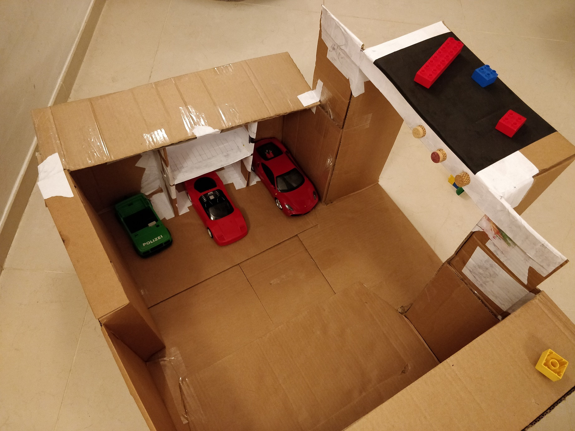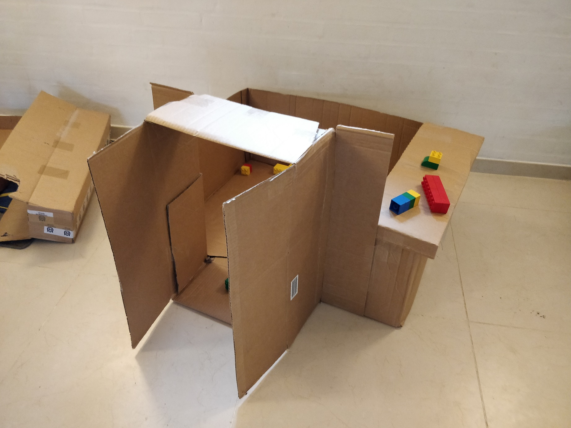 Da jeg byggede det her, havde jeg ikke tænkt så meget over det. Jeg havde bare lidt andre småkasser liggende, jeg syntes, det var sjovt at bygge på, så døre og vinduer blev mere udfordrende at kravle igennem. Også fandt jeg en magnetlukning til et gammelt skab, jeg satte i døren!