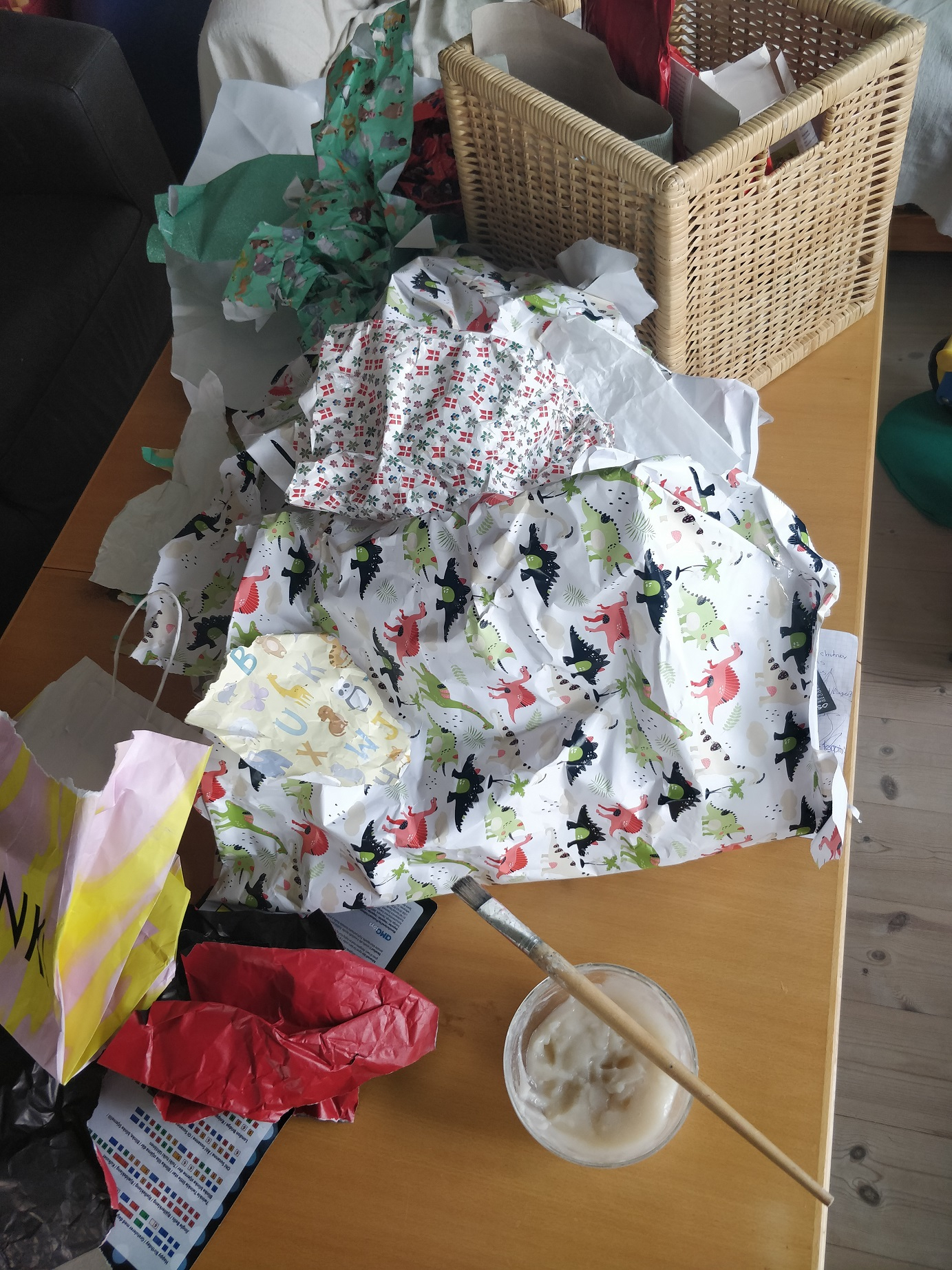 Så da vi havde holdt fødselsdag og efterladenskaberne var en stor bunke, faktisk ret flot gavepapir, som jeg syntes var synd bare at smide ud, besluttede jeg mig yderligere for at tapetsere legehuset med det! Også med det der hjemmelavede tapetklister. Så nu er det blevet et skørt sammensurium af dinosaurer, enhjørninge, rumhajer og en masse andre dyr. Dørene var også ved at gå lidt i stykker, så i samme omgang gik jeg i gang med at reparere og forstærke dem, så de for fremtiden kan holde til at blive kravlet på. Også af min nu snart ret store dreng! ?