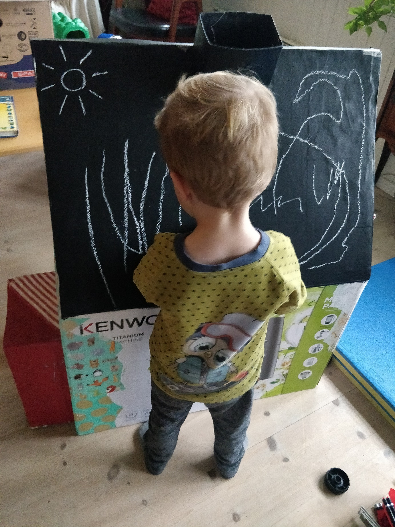 Vi havde så legehuset stående ved et sydvendt vindue, og det betyder at papiret, på den side, der fik sol, falmede ret kraftigt! Så min seneste opgradering var at male den side af taget med tavlelak, og så kan man stå og tegne med kridt der. Det er faktisk en virkelig fin arbejdshøjde! ?