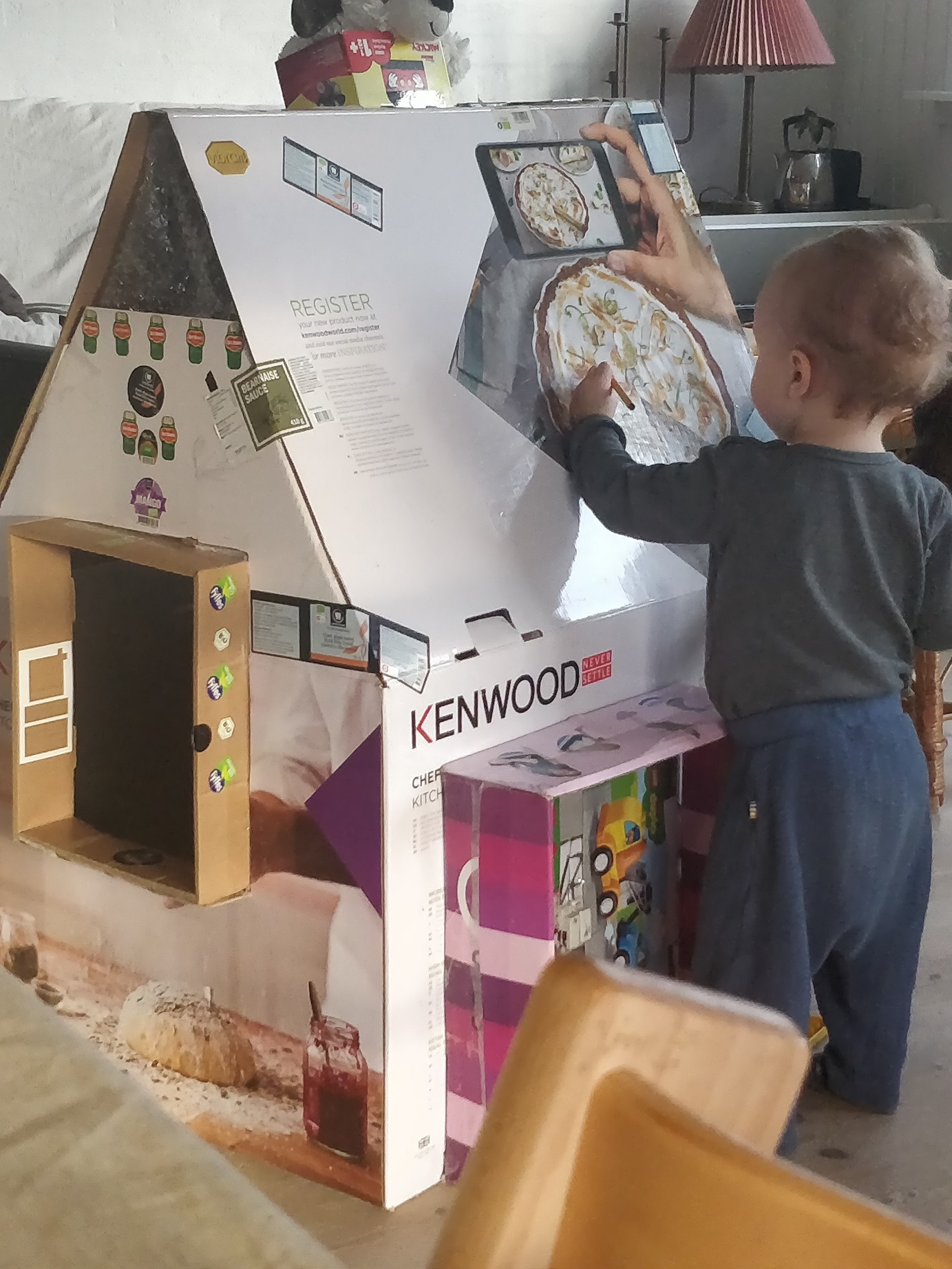 Jeg kan huske, at jeg tænkte at det var lidt fjollet at bygge en skorsten på, for det vidste han jo ikke hvad var på det tidspunkt, men det lærte han hurtigt! Så kravlede han op på en af dørene og puttede bolde ned i. Og da han blev lidt større, blev de skudt ud den anden vej i stedet for! ?