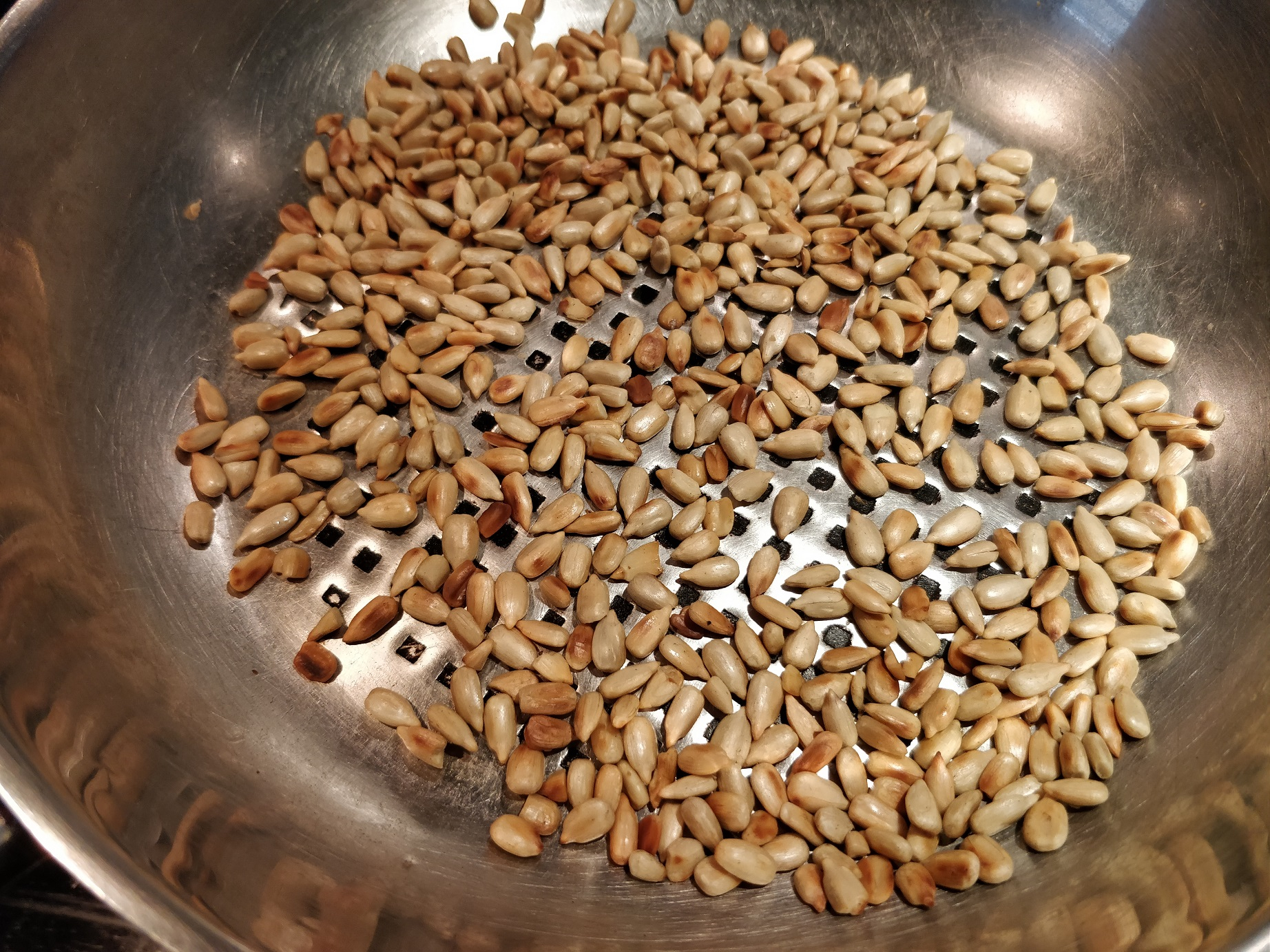 Derudover skal man bruge en håndfuld nødder eller kerner. Solsikkefrø, pinjekerner, mandler eller måske valnødder. – De kan ristes let på en tør pande, så man får fremhævet nødde-smagen.