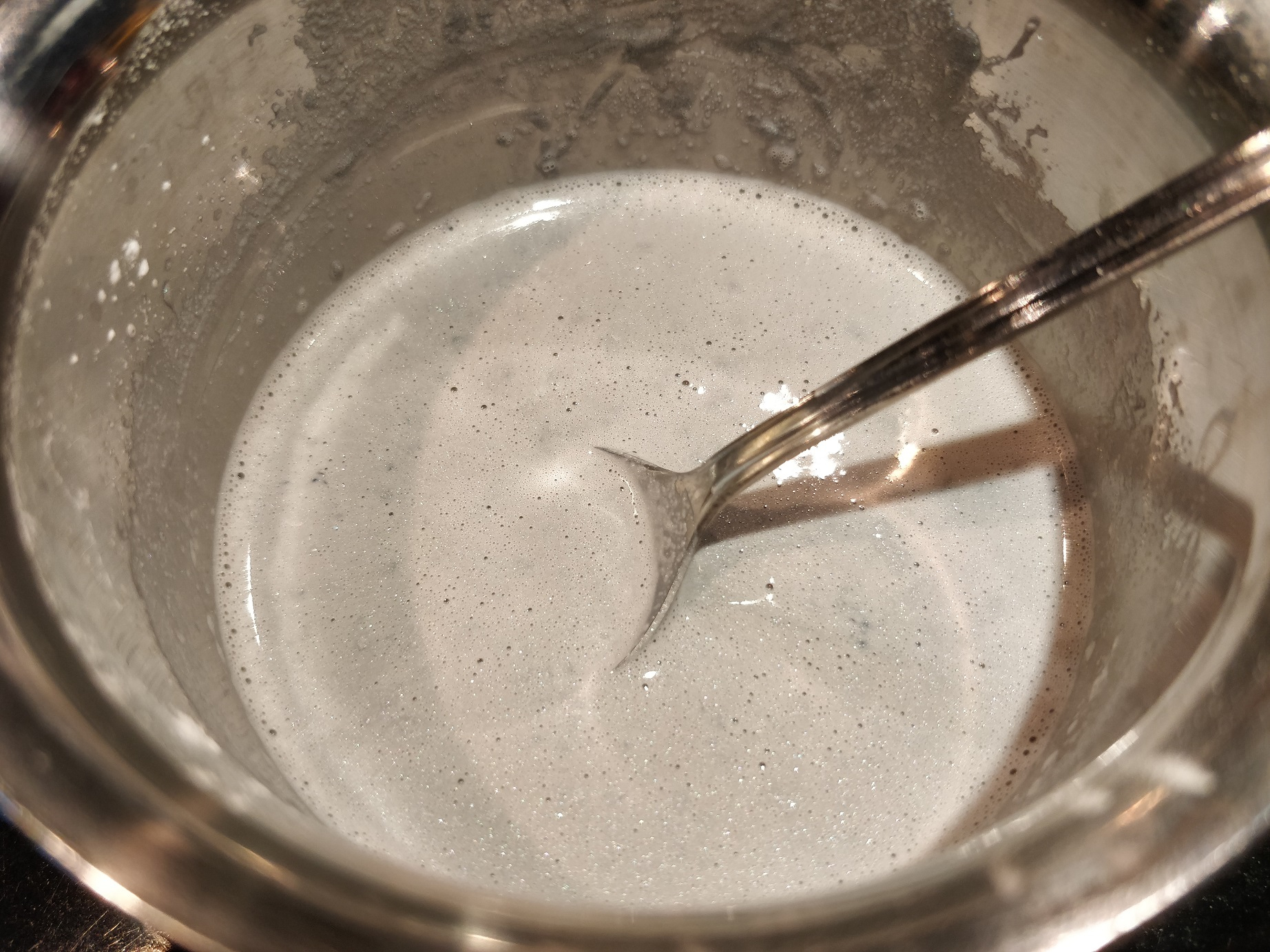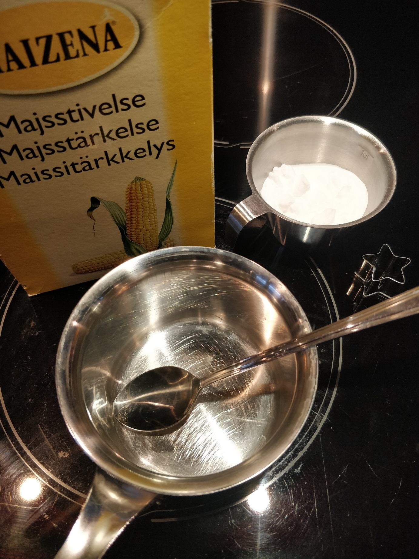 Til projekter som disse, bruger jeg den opskrift på hjemmelavet selvhærdende ler, jeg i forvejen har liggende her på bloggen. Men jeg lavede kun en ganske lille portion denne gang. Jeg lavede af en halv dl natron, en kvart dl majstivelse og et sted mellem en kvart og en halv dl væske, men jeg holdt noget af vandet igen og tilføjede i stedet lidt sølvfarvet maling med perlemor, som jeg ville prøve at farve mine stjerner med. Det var lidt et forsøg, for tidligere har jeg kun farvet selvhærdende ler med frugtfarve (og glimmer) men det her kunne altså også sagtens lade sig gøre, kan jeg nu berette. 😀