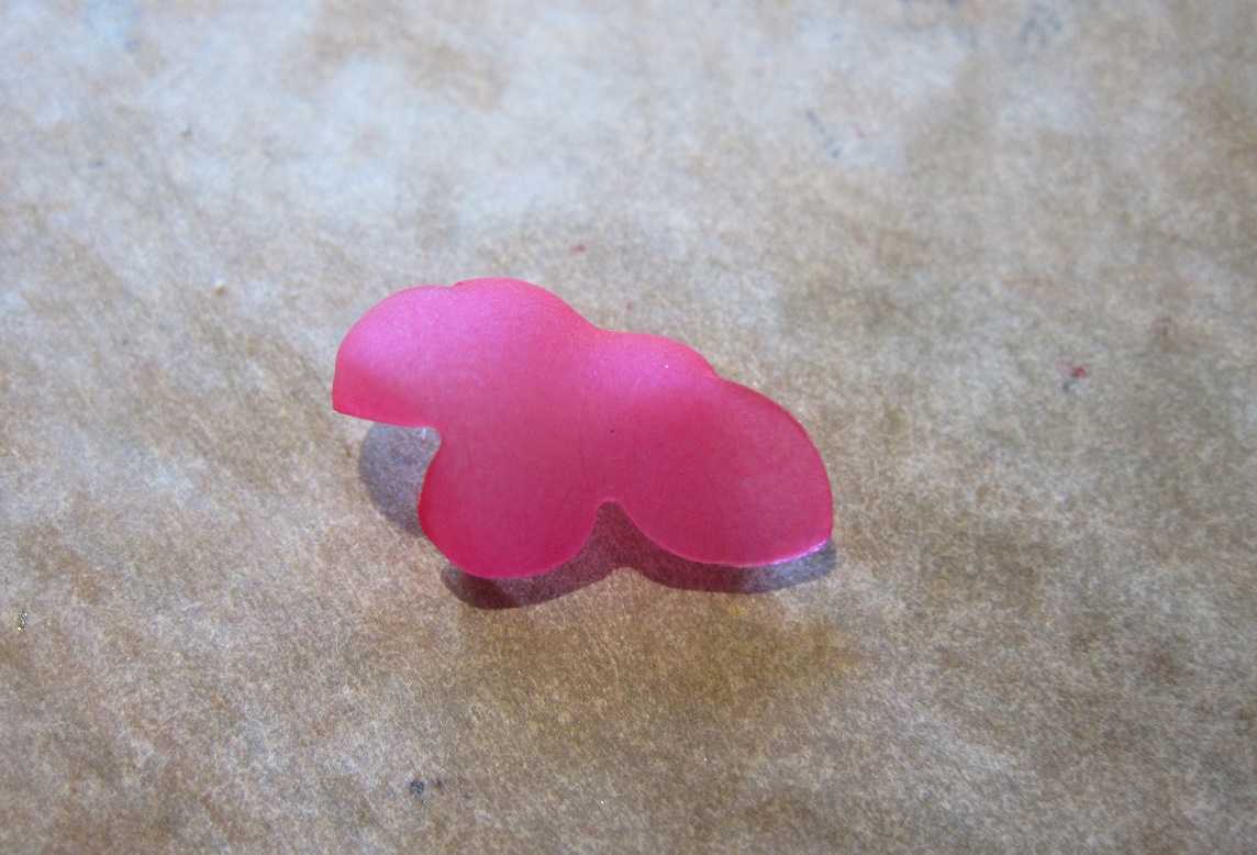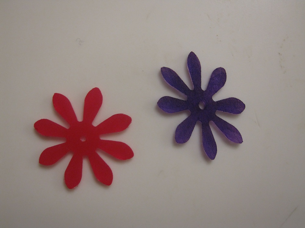 I pakken jeg købte, krymper det farvede krympeplast umiddelbart rimelig lige, men de sorte, hvide og gennemsigtige ark, krymper helt fjollet. (Den lilla blomst i midten, er gennemsigtig krympeplast, jeg har farvet)