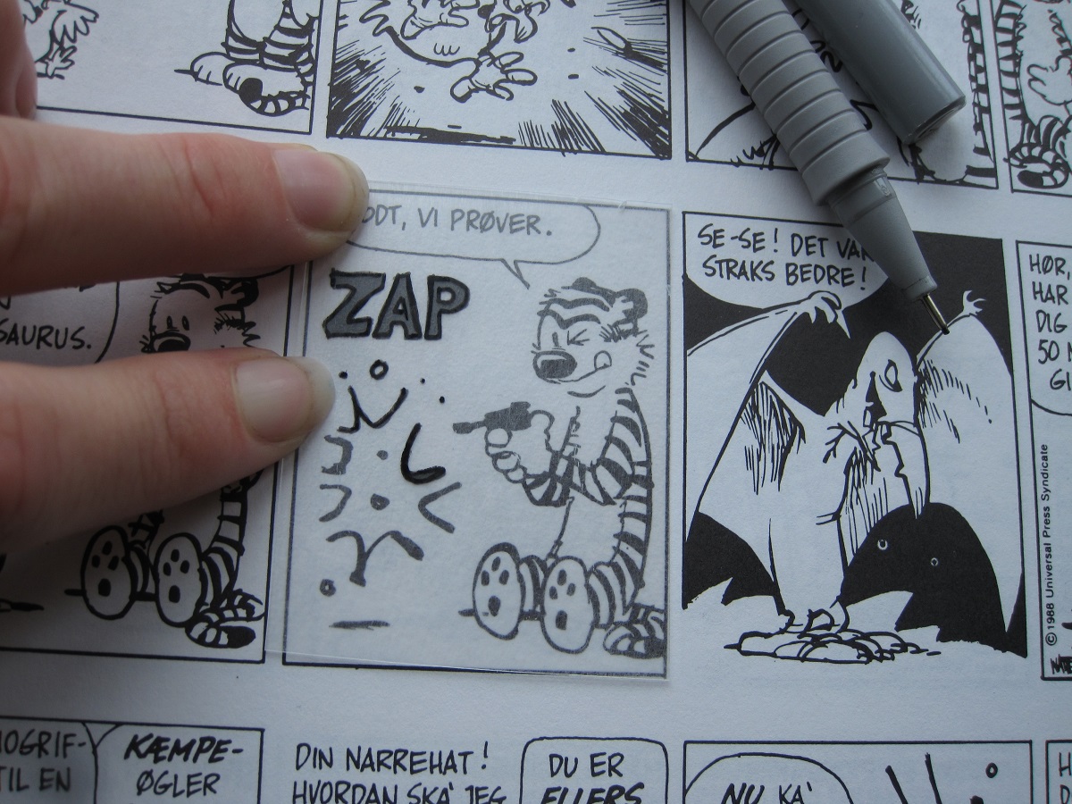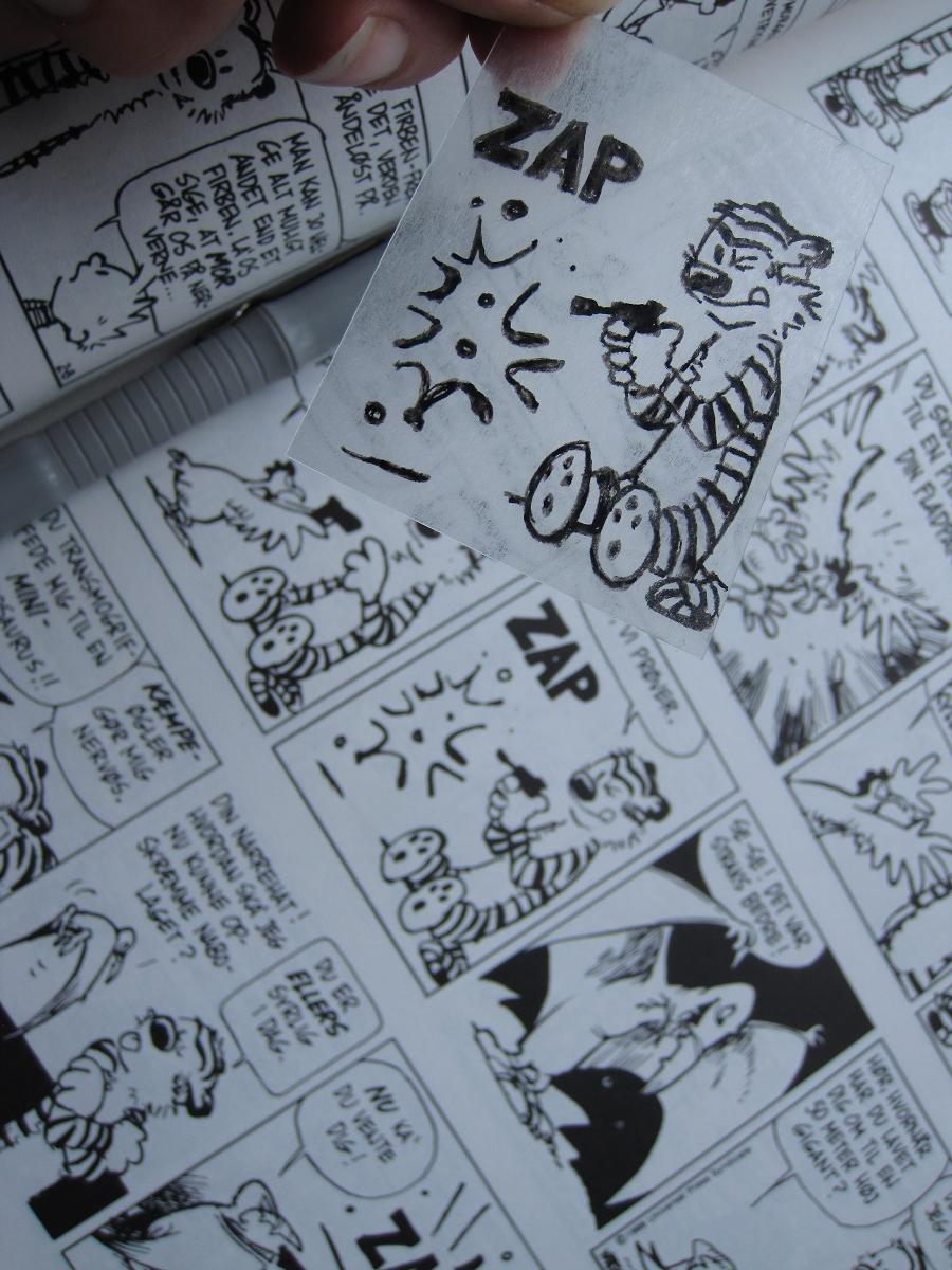 Har man ikke mod på at kaste sig ud i frihåndstegning, kan man let tegne oven på noget andet. Man lægger blot et let gennemsigtigt ark krympeplast oven på f.eks en bog eller et blad, med en tegneseriefigur eller noget lignende, man godt kunne tænke sig, og tegner… Så er man næsten garanteret et fint resultat. 😉