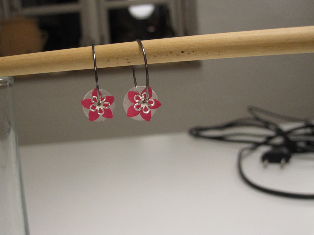 Jeg nævnte tidligere smykker og nøgleringe. Forskellige størrelser motiver egner sig, selvfølgelig mere eller mindre, til forskellige ting. f.eks er søde småting som blomster og stjerner vældig gode til ørestikker. De lidt større motiver, synes jeg, i sig selv, er for lette til hængende øreringe, men sætter man flere ting sammen, eller sammensætter med andre ting, som metalblomsten på creolerne herunder, synes jeg det kan give nogle rigtig interessante resultater. Det er mest sådan jeg selv arbejder med krympeplast. Stansejernet vil jeg komme ind på lige om lidt…