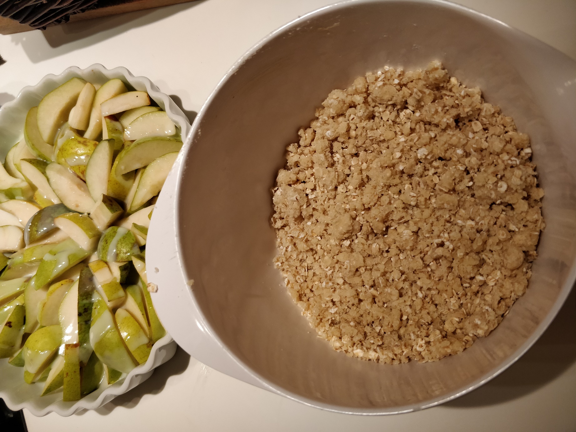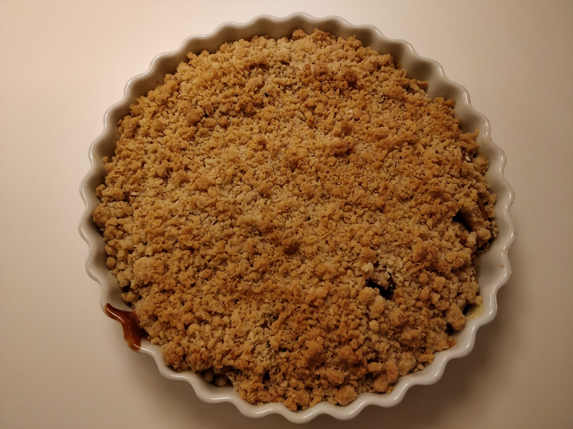 Mit tærtefad her, er ca. 25cm i diameter. Portionen kan sagtens fordobles eller halveres, alt efter størrelsen på ens fad og selvfølgelig, hvor meget pærecrumble man skal bruge. Faktisk kan man justerer den fuldstændigt, til den størrelse, man har brug for, da antallet af gram, der skal bruges af hver ingrediens jo er det samme. Så hvis det passer bedre med f.eks 120 gram af hver, så gør man bare det. 🙂