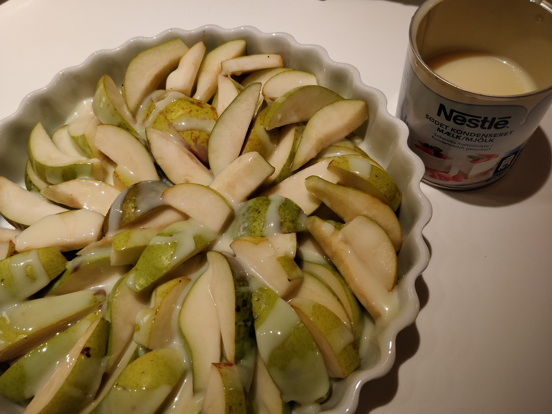 Lige her kommer opskriften med pære og kondenseret mælk…