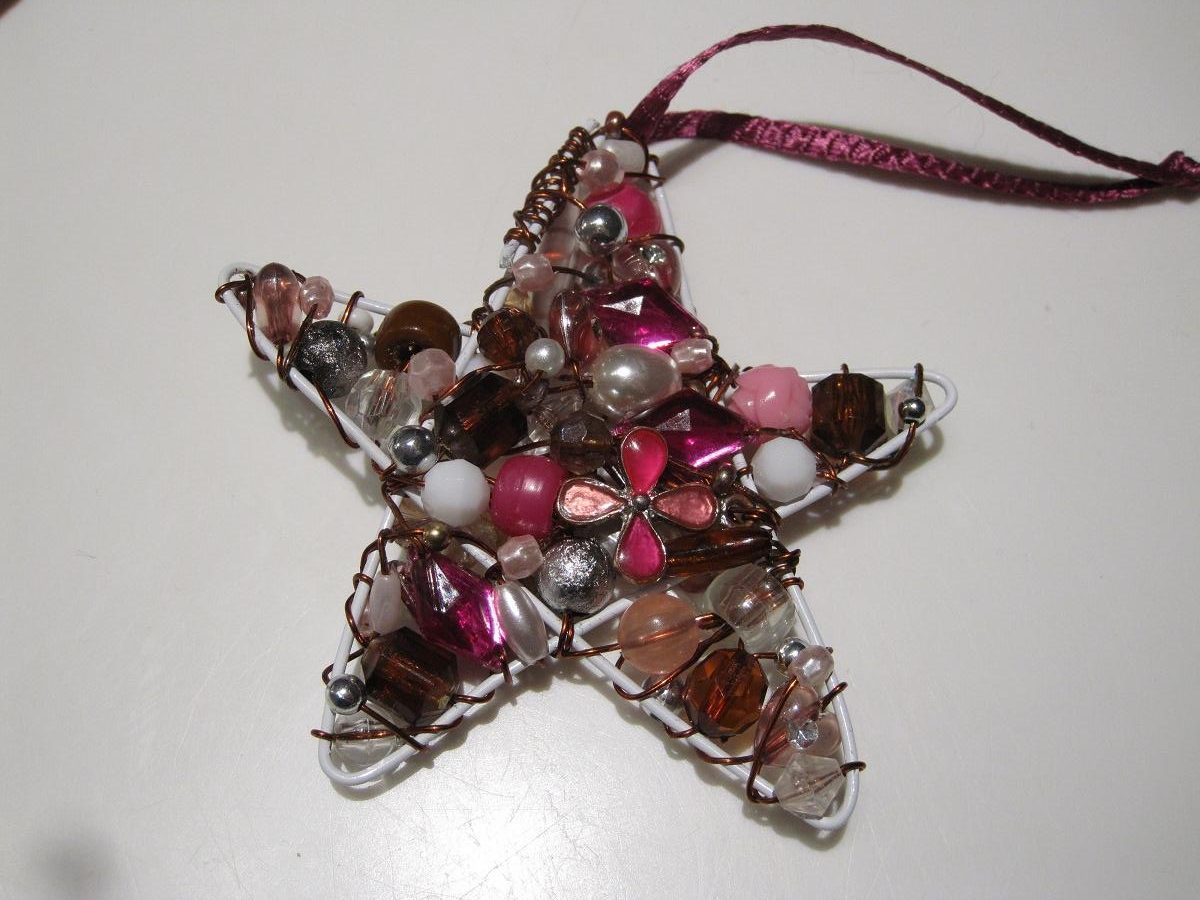 Først vikles den tynde ståltråd et par gange om de overlappende ender på stjernen, så de bliver låst fast. Herefter kan man begynde at sy perler på. Jeg starter altid med at sætte et par perler på ståltråden og så sy hjørnerne i stjernen sammen, idet jeg sørger for, at formen er som jeg vil have. Derefter er det bare at fylde alle felterne ud og sy godt på kryds og tværs, evt. flere gange igennem nogle af perlerne, så det hele sidder rigtig godt fast.