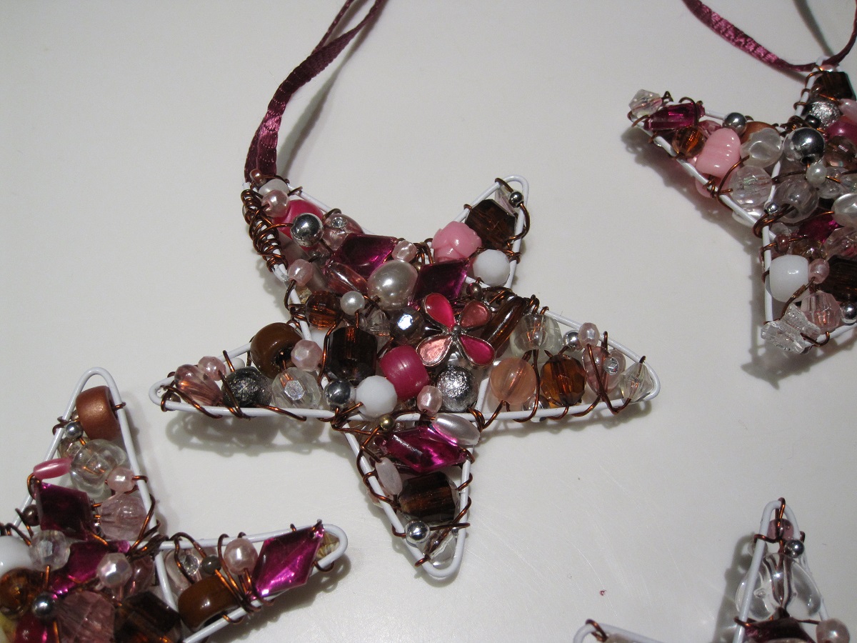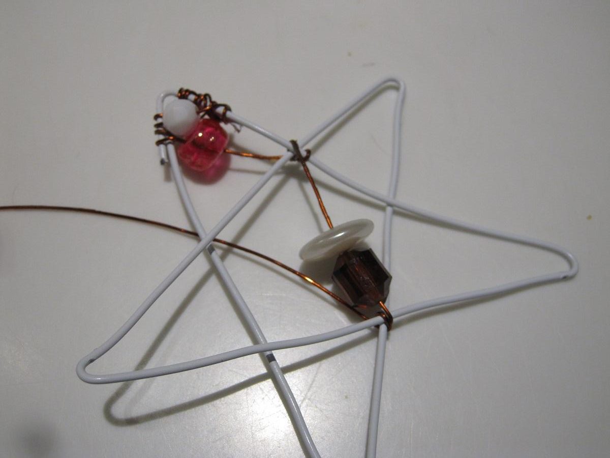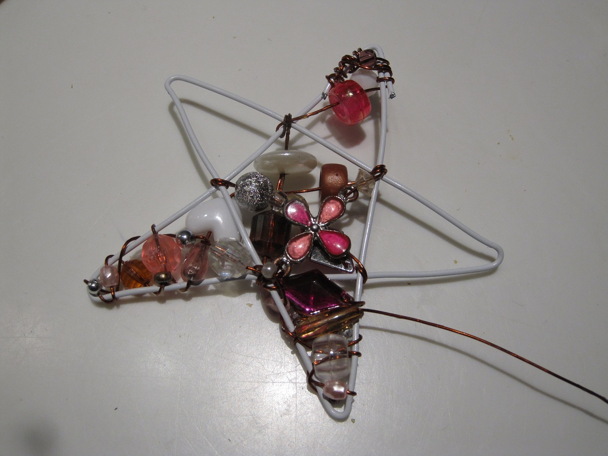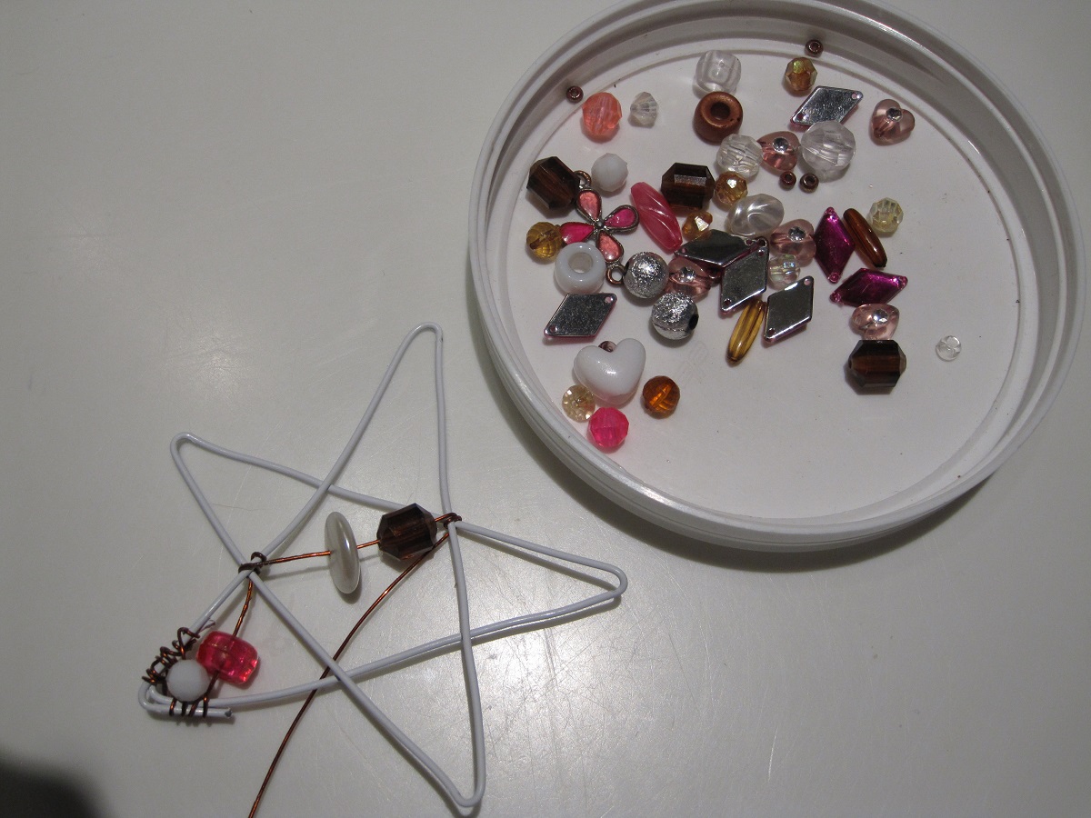 Man skal bruge to slags ståltråd. Noget kraftigt til at lave selve skelettet på stjernerne, og noget tyndere til at sy perlerne på med. Til mine stjerner brugte jeg spiralryggen fra en gammel kalender, og kobbertråd fra noget elektronik, jeg har skilt ad. Man kan selvfølgelig sagtens købe ståltråd. Der findes masser af spændende farver osv, man kan lege med. 🙂