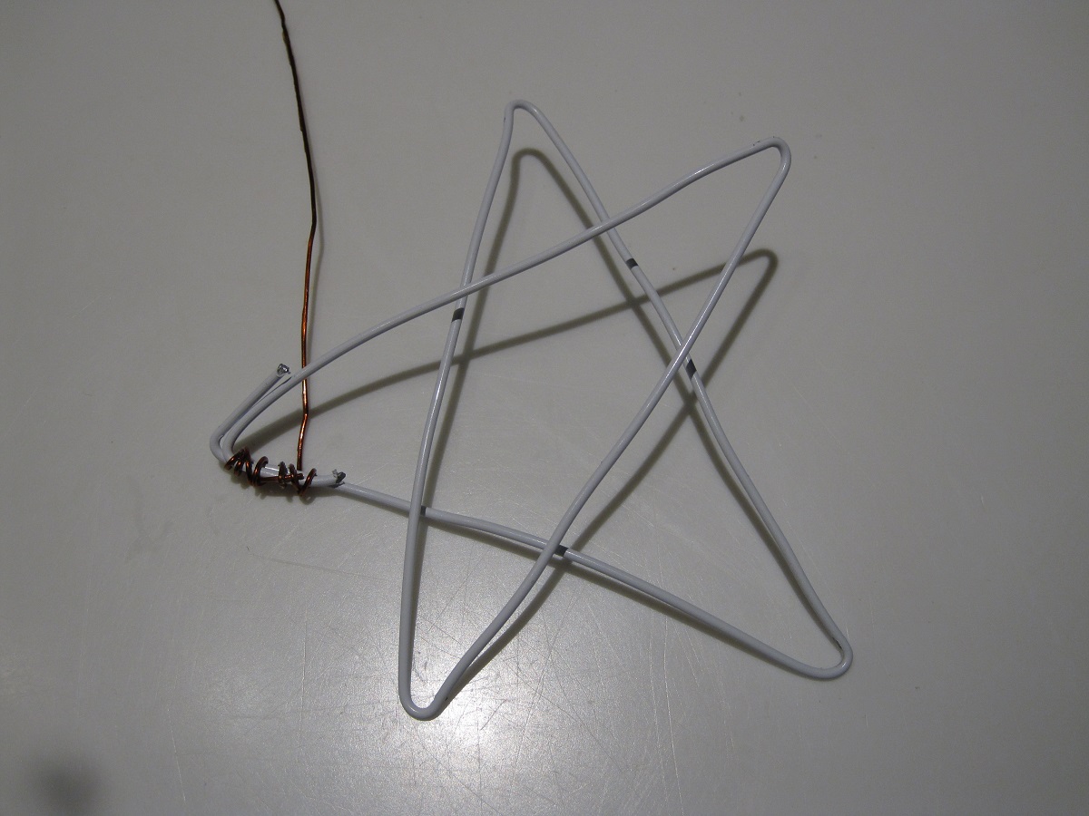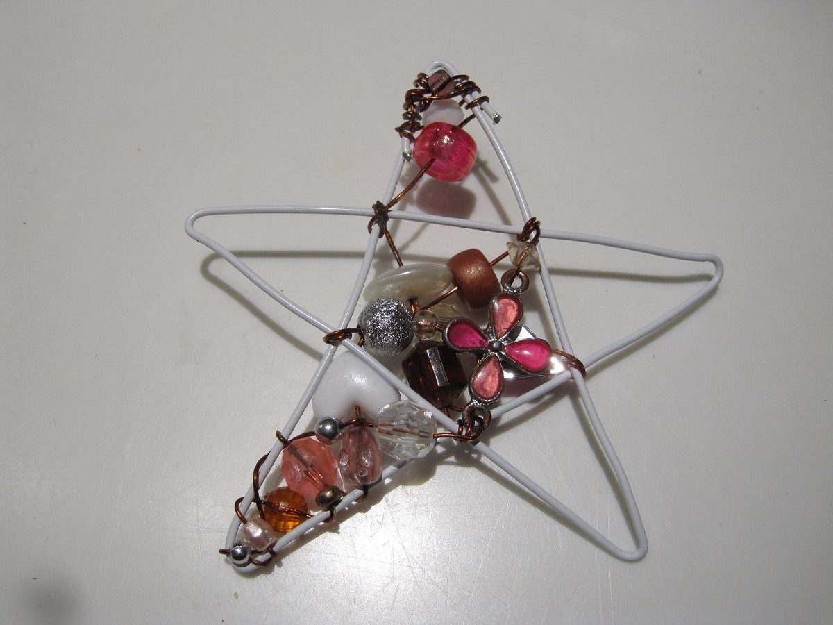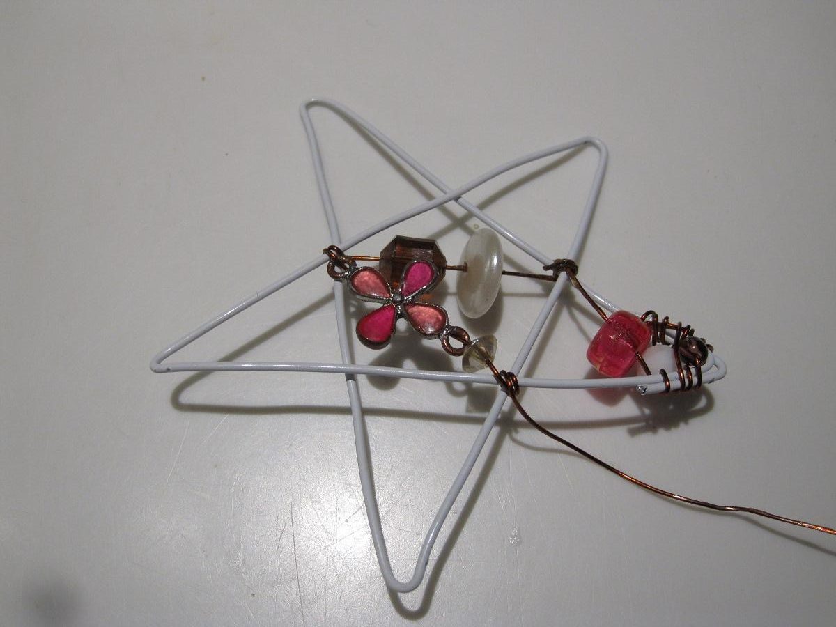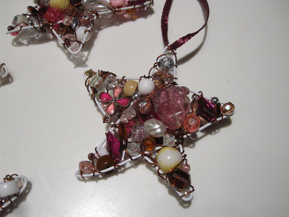 Man skal bruge to slags ståltråd. Noget kraftigt til at lave selve skelettet på stjernerne, og noget tyndere til at sy perlerne på med. Til mine stjerner brugte jeg spiralryggen fra en gammel kalender, og kobbertråd fra noget elektronik, jeg har skilt ad. Man kan selvfølgelig sagtens købe ståltråd. Der findes masser af spændende farver osv, man kan lege med. 🙂