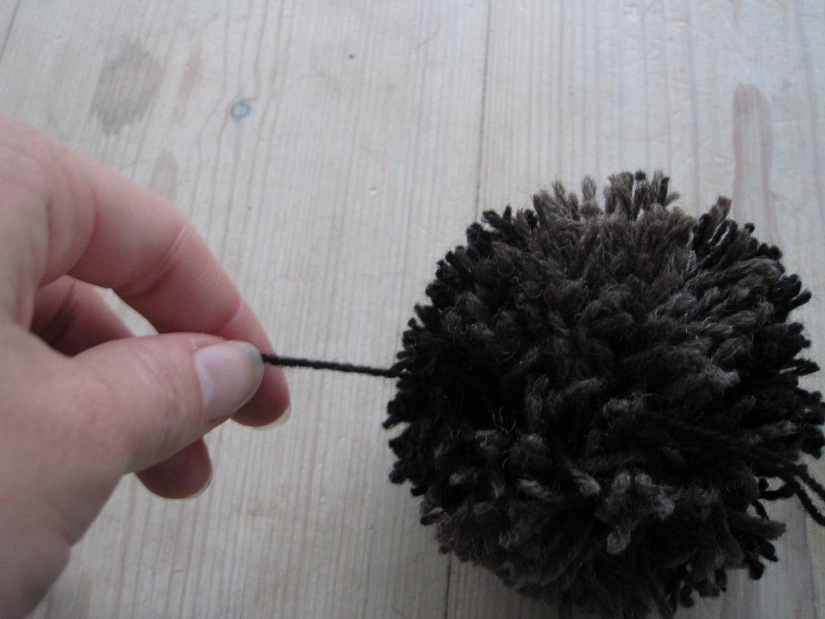 Snorene der er bundet om midten, kan man bruge til at sy dullen fast på en hue, hvis den skal det. Måske en nissehue eller lignende? Hvis den ikke skal sys på noget, kan man bare klippe dem af, i samme længde som resten af garnstumperne, eller tættere ved midten, hvis man har brugt en anden farve garn til at binde med.