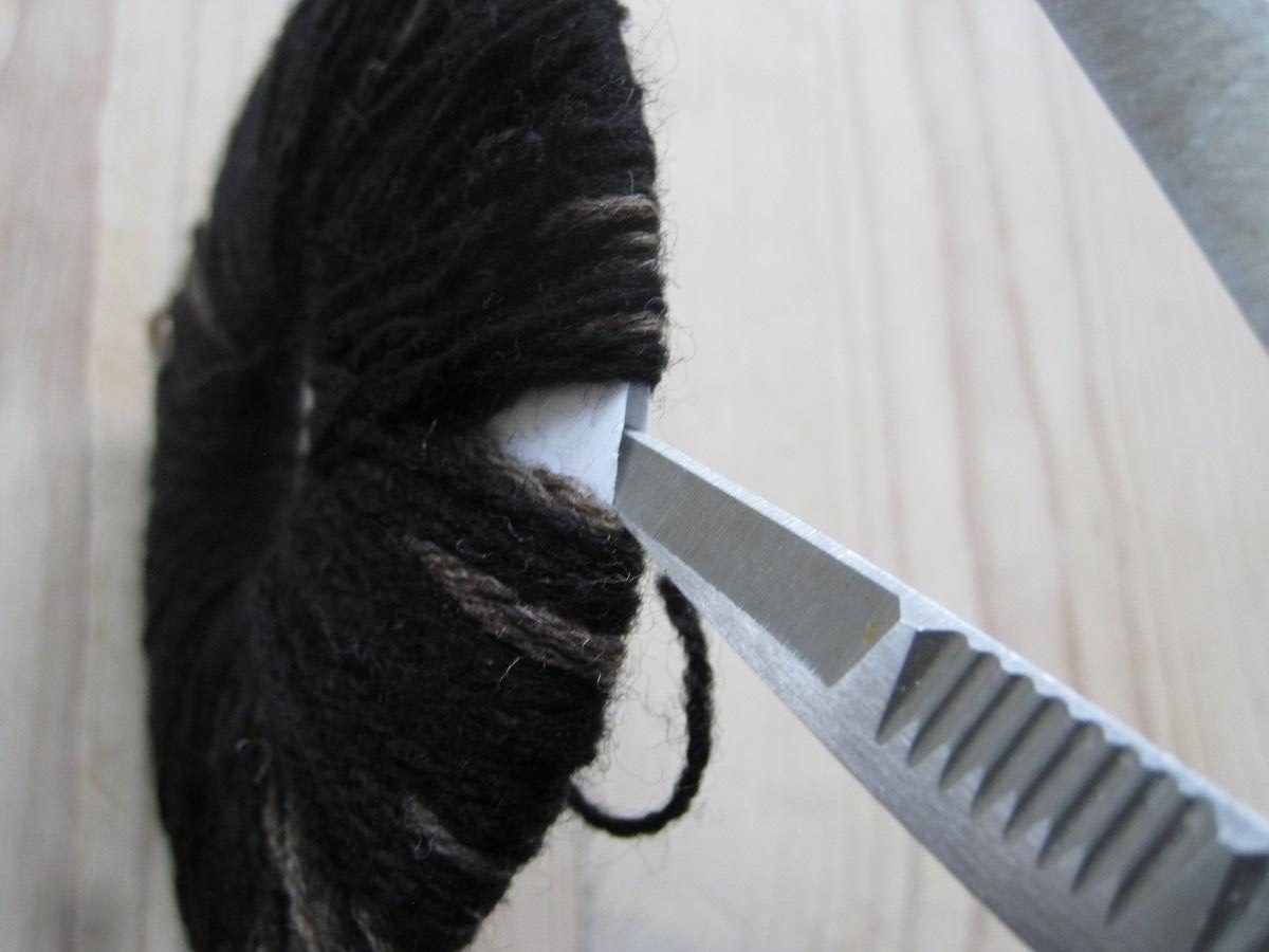 Når man er færdig med at vikle, skal dullen klippes op. Det gør man ved at pille garnet lidt fra hinanden, så man kan klemme saksen ind mellem de to lag af skabelonen, og så klipper man altså imellem lagene hele vejen rundt.