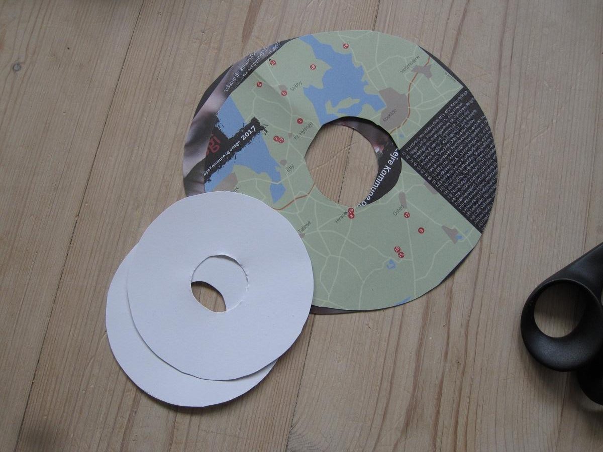 Man starter med at klippe en skabelon, der skal have to ens dele. To cirkler med huller i midten, som man tegner op på karton og klipper ud. Man kan lave dem i alle mulige forskellige størrelser, der skal bare kunne komme et lille garnnøgle igennem midten. Dullen bliver lidt mindre end karton cirklen, da den bliver strammet til i midten. Men ellers er det bare at tegne med en passer, eller rundt om en skål, eller noget andet rundt, i passende størrelse, og klippe de to skabelondele ud.