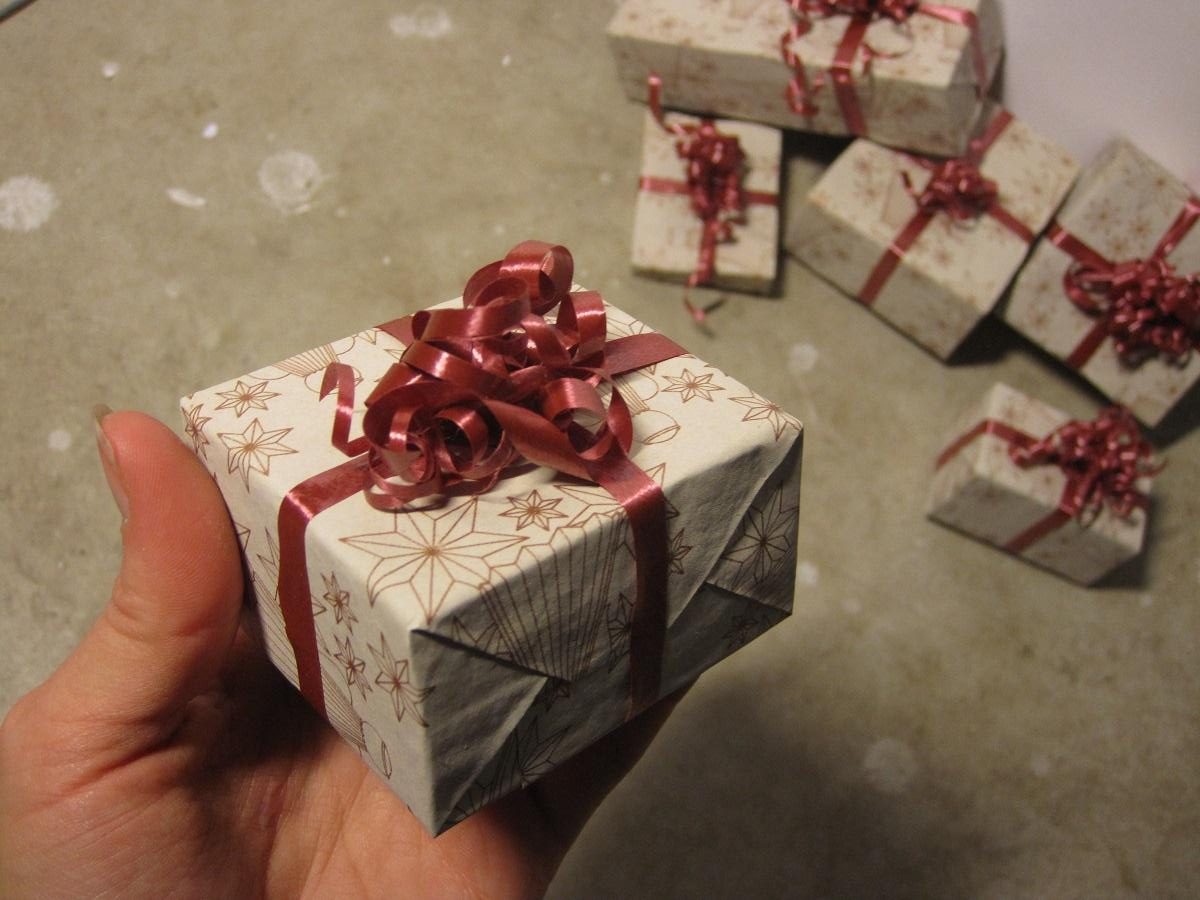 Pakkerne skal helst tørre lidt, inden man binder bånd omkring, og sætter snor i, til ophæng. (Hvis man vil have det) Ellers kommer man let til, at krølle og ødelægge papiret. Men når det er gjort, er man tilgengæld også færdig, og har nu det fineste, hjemmelavede og billige julepynt. 🙂
