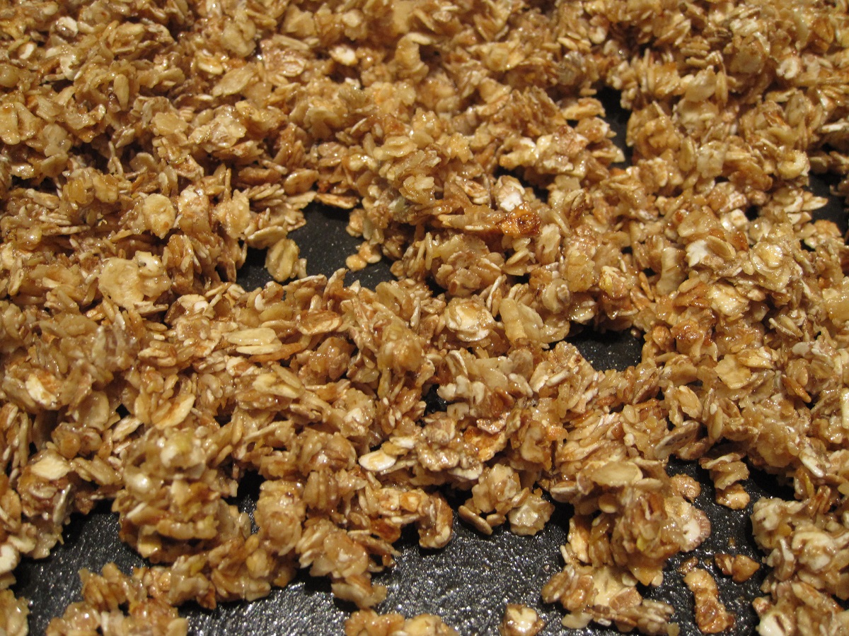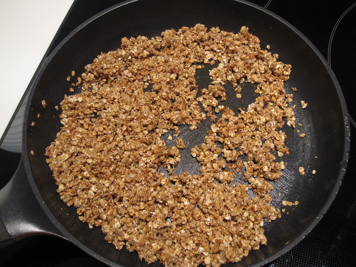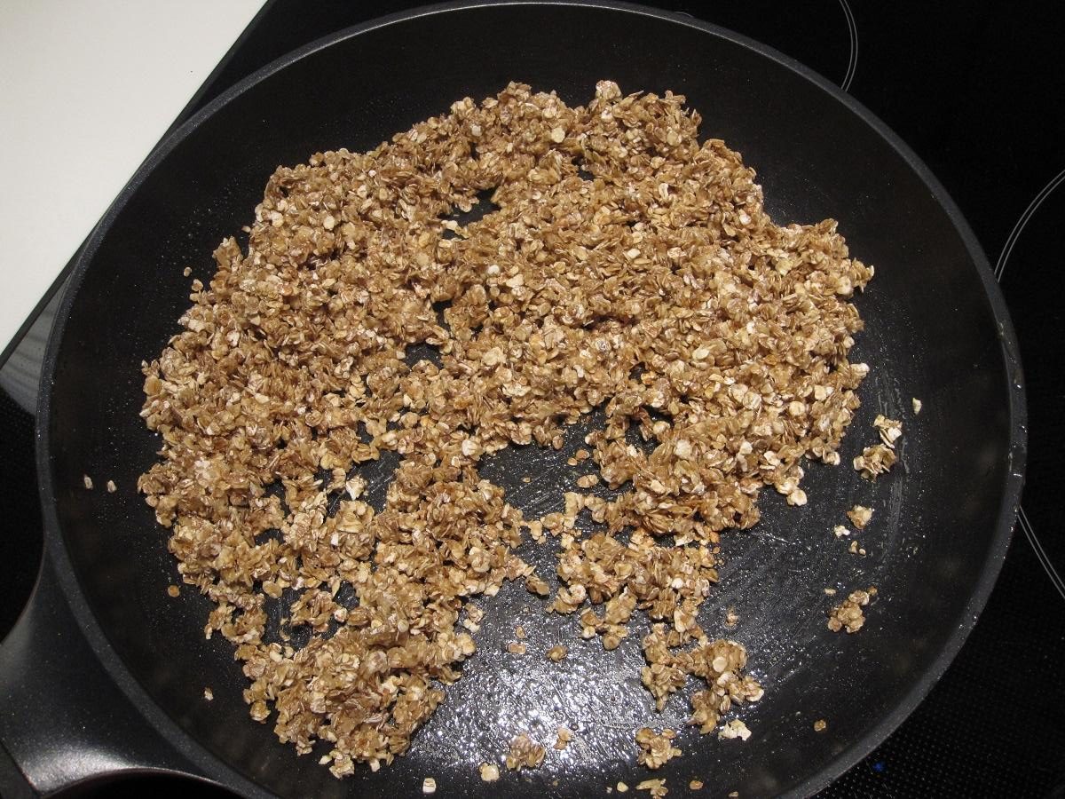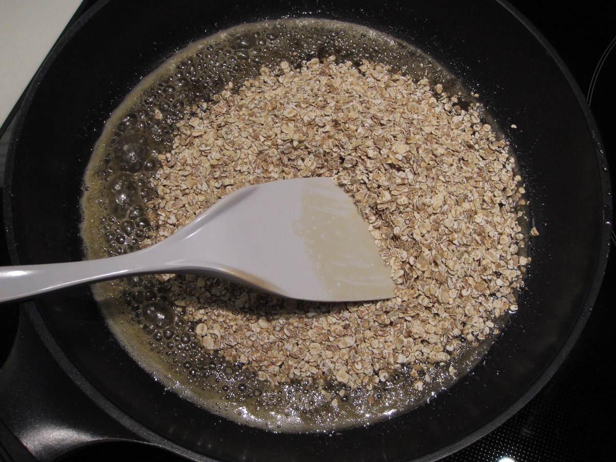 Først smelter man lidt fedtstof, ved middel varme, på en pande, så smeltes også honning og sukker. Sukkeret skal helst være helt opløst, før man tilsætter havregrynene, men det må selvfølgelig ikke brænde af. Når havregrynene er tilsat, skal det hele blot blandes og riste, indtil det er blevet let gyldent. Så kan man hælde det i en skål og servere det, enten brandvarmt eller afkølet, men det er nemmest, at få af panden, imens det er varmt. 😉
