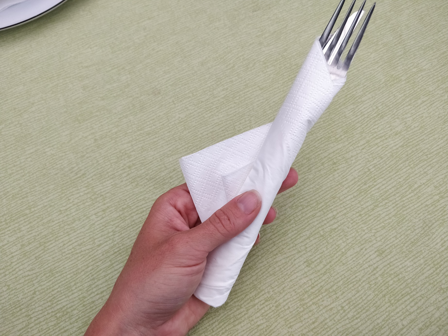 Så folder man den ene side ind over, og trykker den godt til, og så ruller man servietten stramt omkring bestikket!