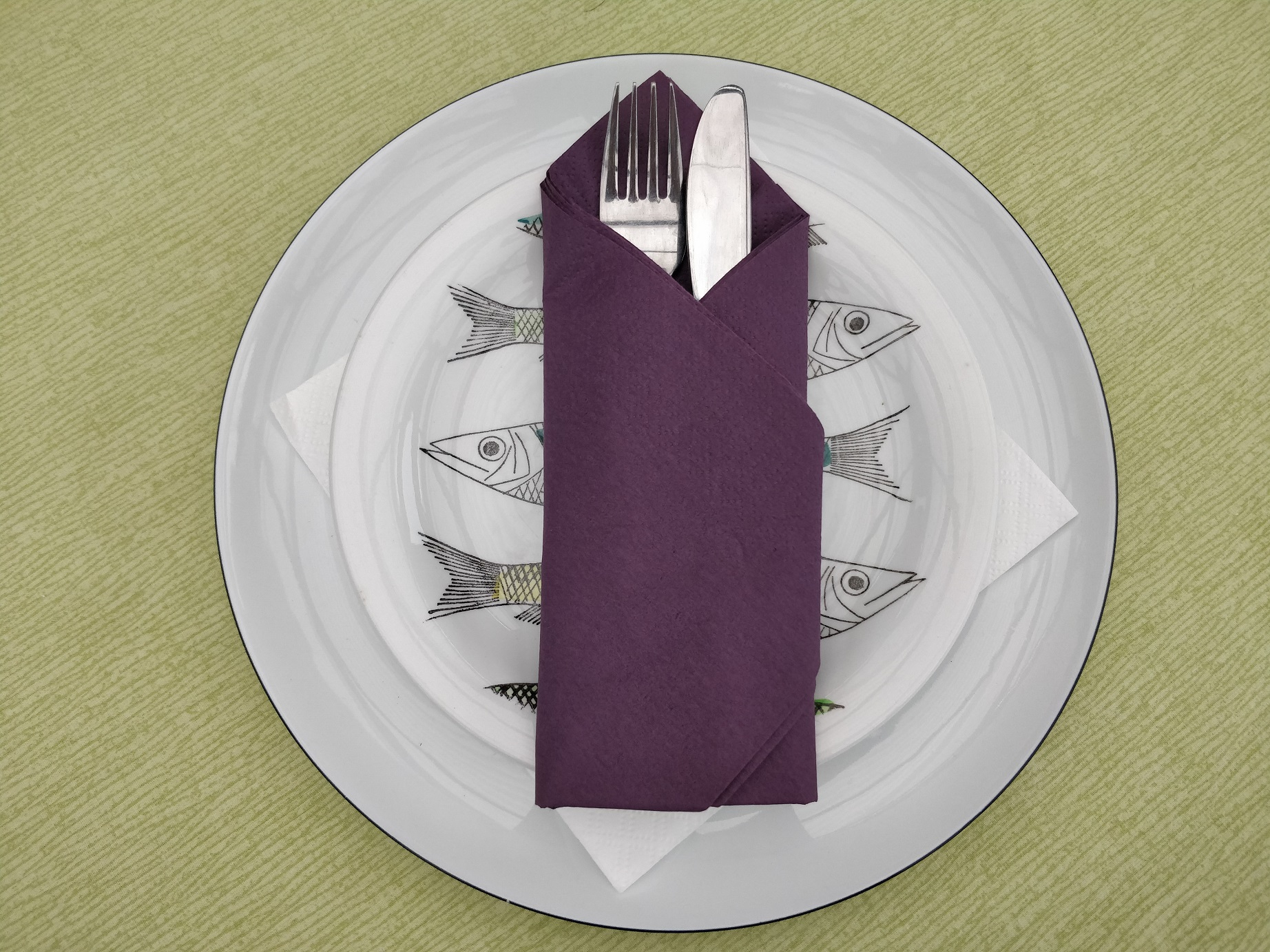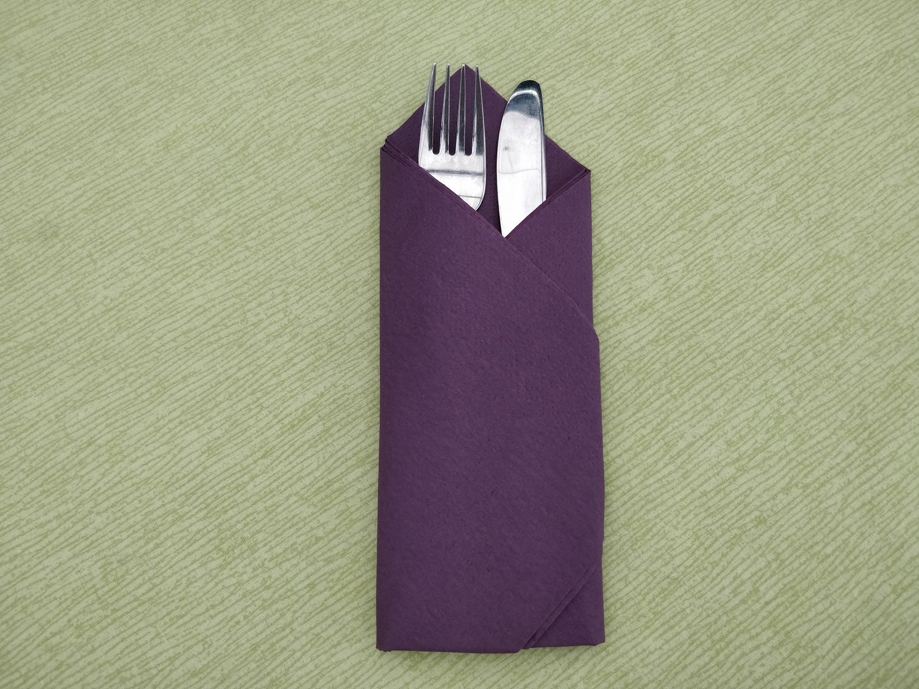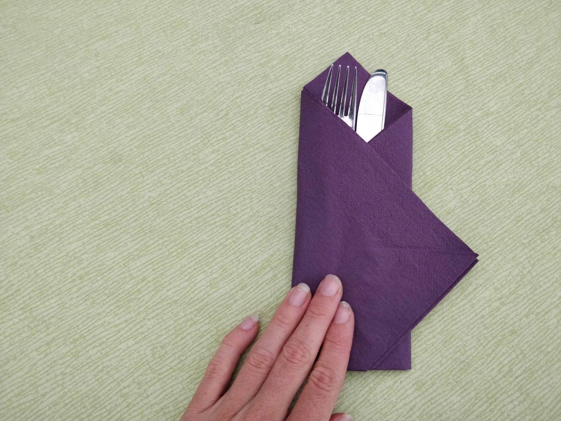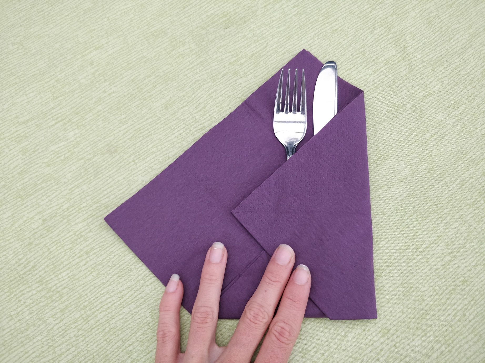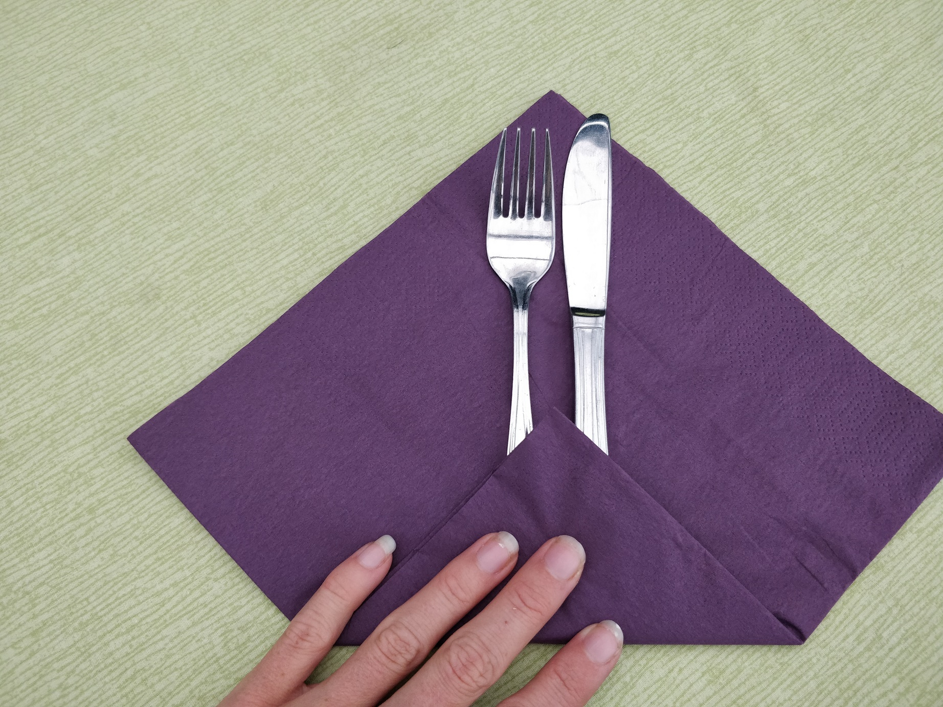 Man starter med at lægge et sæt bestik diagonalt på en serviet. Så langt oppe eller nede på servietten, som man synes det skal være synligt i toppen. På den måde tilpasses størrelsen automatisk til størrelsen på ens bestik. For det kan der jo godt være temmelig stor forskel på!