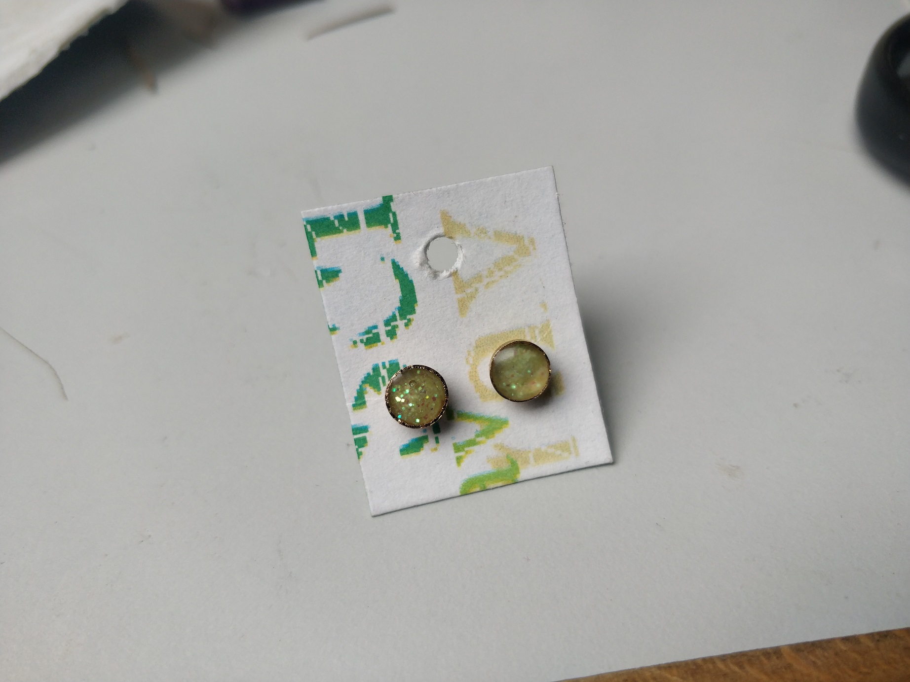 Jeg bruger primært mine skuffer til at hænge øreringe i. Det gør jeg ved at tage en lille lap af noget fint karton, og lave et hul med en hultang eller hulmaskine, som passer til hovedet på mine søm og skruer. Så stikker jeg også to små huller i kartonen med en nål, i passede afstand, og deri sætter jeg øreringene. Og så kan man jo evt. Skrive pris på lappen. Så sidder øreringene samlet, og man kan lige putte dem ned i en lille pose eller æske, hvis der er nogen, der køber et par, uden at de ligger og roder rundt.